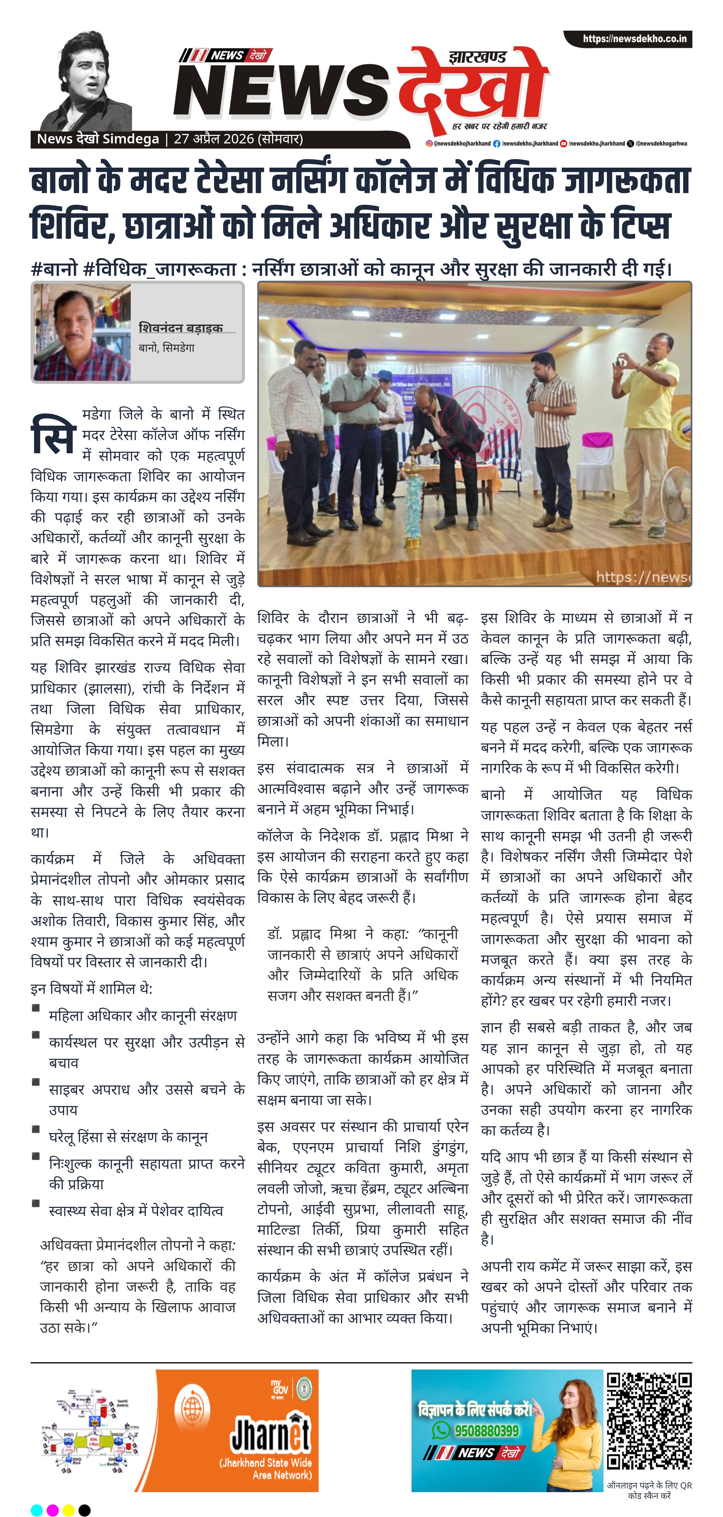 सिमडेगा जिले के बानो स्थित मदर टेरेसा कॉलेज ऑफ नर्सिंग में विधिक जागरूकता शिविर आयोजित किया गया। कार्यक्रम का उद्देश्य नर्सिंग छात्राओं को उनके अधिकारों और कानूनी सुरक्षा के प्रति जागरूक करना था। झालसा और जिला विधिक सेवा प्राधिकार के संयुक्त तत्वावधान में विशेषज्ञों ने विभिन्न कानूनी पहलुओं की जानकारी दी। इस पहल से छात्राओं में जागरूकता और आत्मविश्वास बढ़ा है।