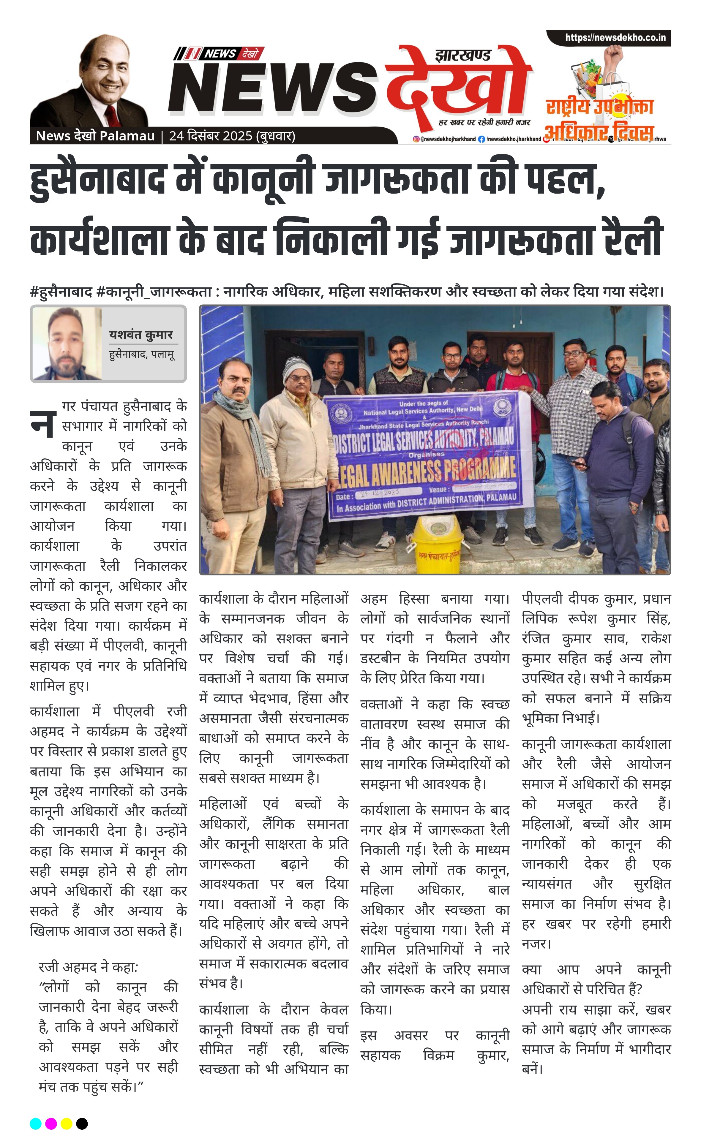 हुसैनाबाद नगर पंचायत सभागार में कानूनी जागरूकता कार्यशाला सह रैली का आयोजन किया गया, जिसमें नागरिकों को उनके कानूनी अधिकारों, महिलाओं एवं बच्चों की सुरक्षा तथा स्वच्छता के प्रति जागरूक किया गया। कार्यक्रम में पीएलवी एवं कानूनी सहायकों ने कानून से जुड़े महत्वपूर्ण प्रावधानों की जानकारी दी। कार्यशाला के बाद जागरूकता रैली निकालकर आम लोगों तक संदेश पहुंचाया गया।