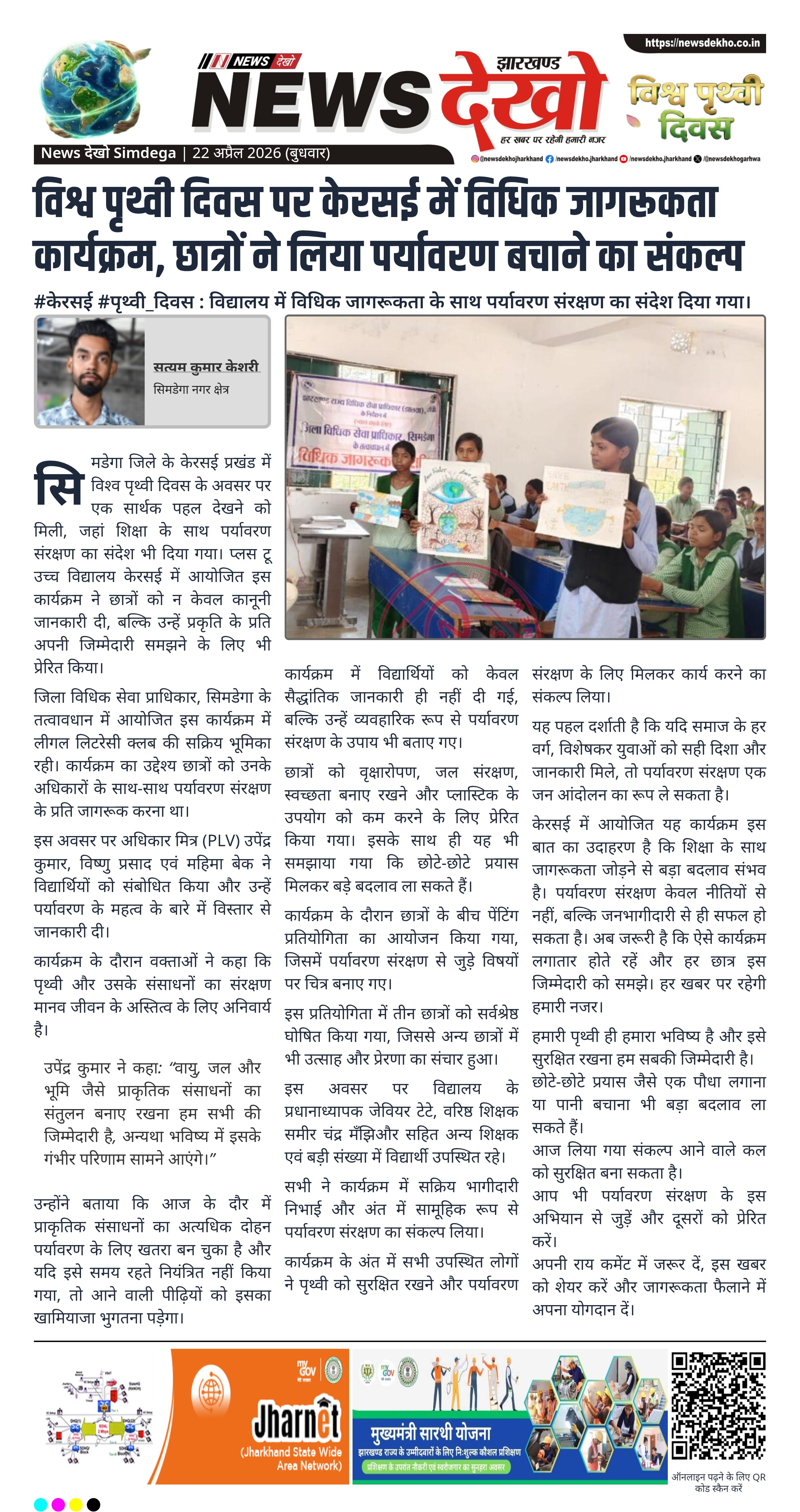 सिमडेगा जिले के केरसई स्थित प्लस टू उच्च विद्यालय में विश्व पृथ्वी दिवस पर विधिक जागरूकता कार्यक्रम आयोजित किया गया। जिला विधिक सेवा प्राधिकार के तत्वावधान में हुए इस आयोजन में विद्यार्थियों को पर्यावरण संरक्षण के प्रति जागरूक किया गया। कार्यक्रम में विशेषज्ञों ने प्राकृतिक संसाधनों के संरक्षण की आवश्यकता पर जोर दिया। छात्रों ने सामूहिक रूप से पृथ्वी को सुरक्षित रखने का संकल्प लिया।