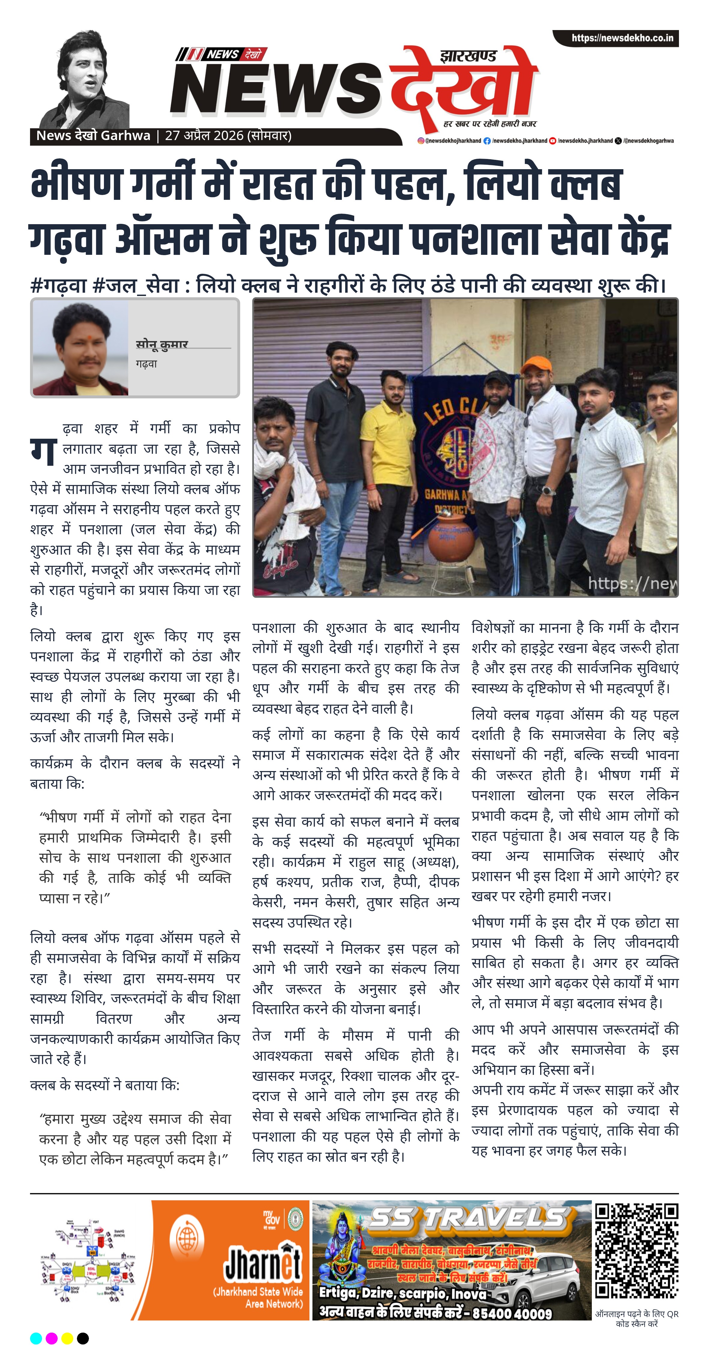 गढ़वा शहर में गर्मी का प्रकोप लगातार बढ़ता जा रहा है, जिससे आम जनजीवन प्रभावित हो रहा है। ऐसे में सामाजिक संस्था लियो क्लब ऑफ गढ़वा ऑसम ने सराहनीय पहल करते हुए शहर में पनशाला (जल सेवा केंद्र) की शुरुआत की है। इस सेवा केंद्र के माध्यम से राहगीरों, मजदूरों और जरूरतमंद लोगों को राहत पहुंचाने का प्रयास किया जा रहा है।