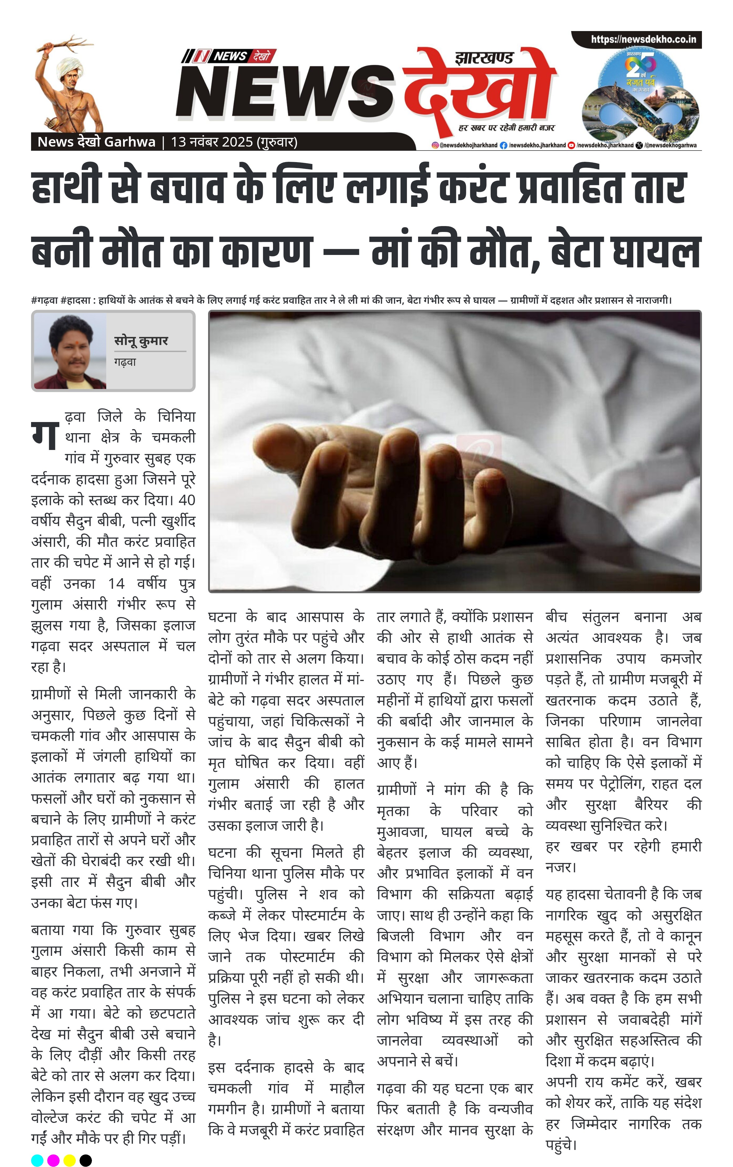 #गढ़वा #हादसा : हाथियों के आतंक से बचने के लिए लगाई गई करंट प्रवाहित तार ने ले ली मां की जान, बेटा गंभीर रूप से घायल — ग्रामीणों में दहशत और प्रशासन से नाराजगी।