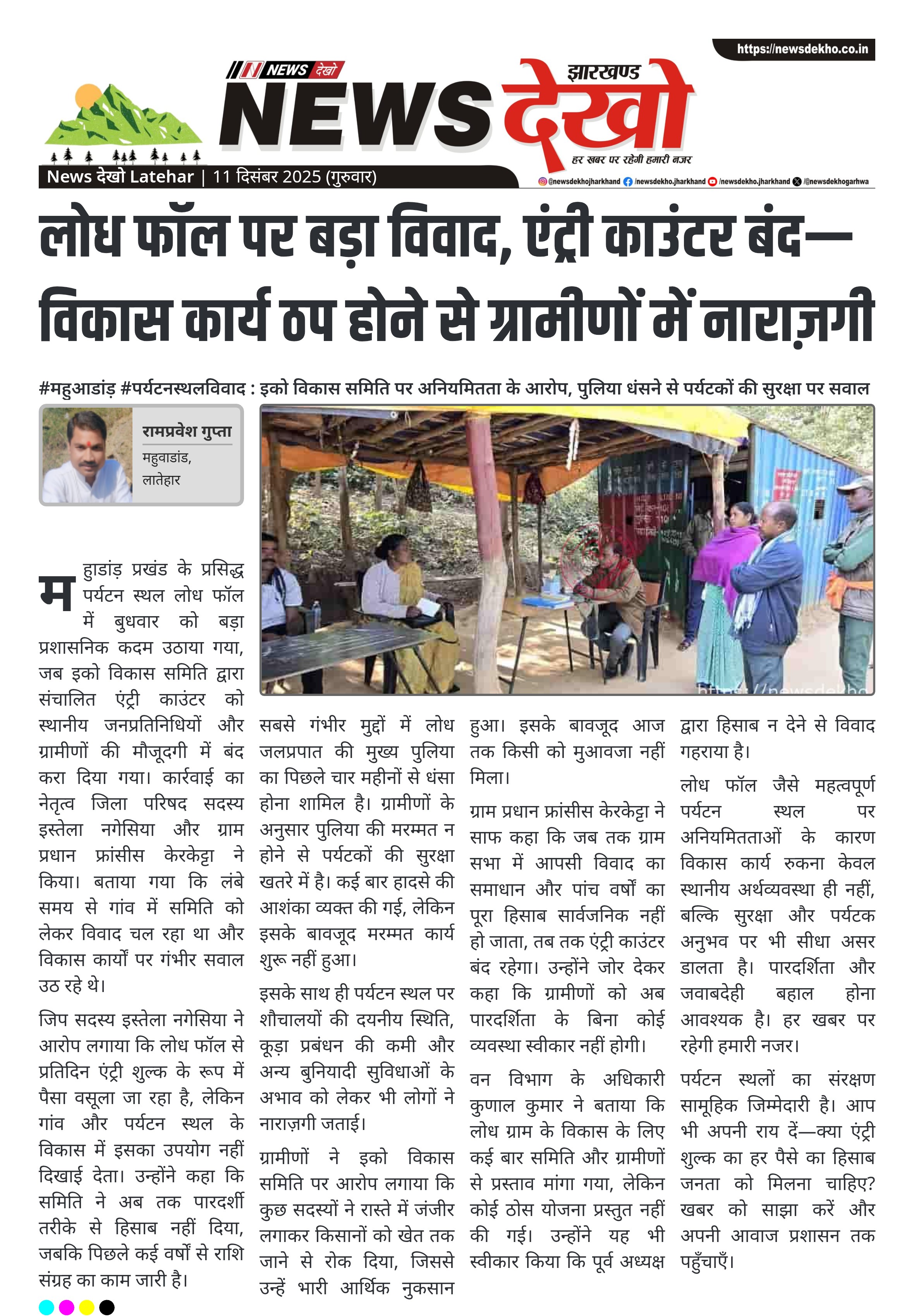 महुाडांड़ प्रखंड के प्रसिद्ध पर्यटन स्थल लोध फॉल में बुधवार को बड़ा प्रशासनिक कदम उठाया गया, जब इको विकास समिति द्वारा संचालित एंट्री काउंटर को स्थानीय जनप्रतिनिधियों और ग्रामीणों की मौजूदगी में बंद करा दिया गया। कार्रवाई का नेतृत्व जिला परिषद सदस्य इस्तेला नगेसिया और ग्राम प्रधान फ्रांसीस केरकेट्टा ने किया। बताया गया कि लंबे समय से गांव में समिति को लेकर विवाद चल रहा था और विकास कार्यों पर गंभीर सवाल उठ रहे थे।