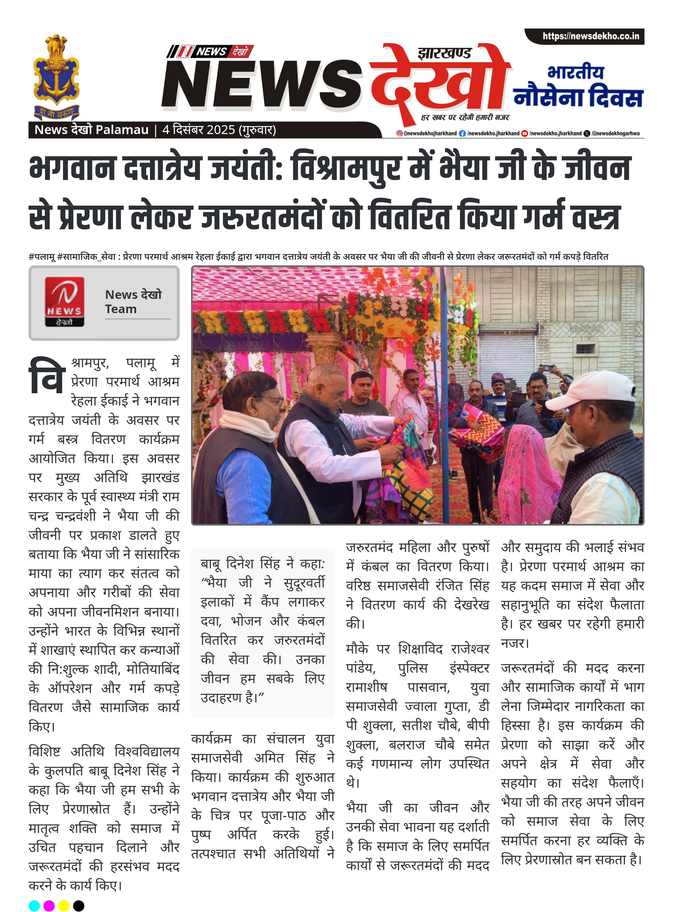 विश्रामपुर, पलामू में प्रेरणा परमार्थ आश्रम रेहला ईकाई ने भगवान दत्तात्रेय जयंती के अवसर पर गर्म बस्त्र वितरण कार्यक्रम आयोजित किया। इस अवसर पर मुख्य अतिथि झारखंड सरकार के पूर्व स्वास्थ्य मंत्री राम चन्द्र चन्द्रवंशी ने भैया जी की जीवनी पर प्रकाश डालते हुए बताया कि भैया जी ने सांसारिक माया का त्याग कर संतत्व को अपनाया और गरीबों की सेवा को अपना जीवनमिशन बनाया। उन्होंने भारत के विभिन्न स्थानों में शाखाएं स्थापित कर कन्याओं की नि:शुल्क शादी, मोतियाबिंद के ऑपरेशन और गर्म कपड़े वितरण जैसे सामाजिक कार्य किए।