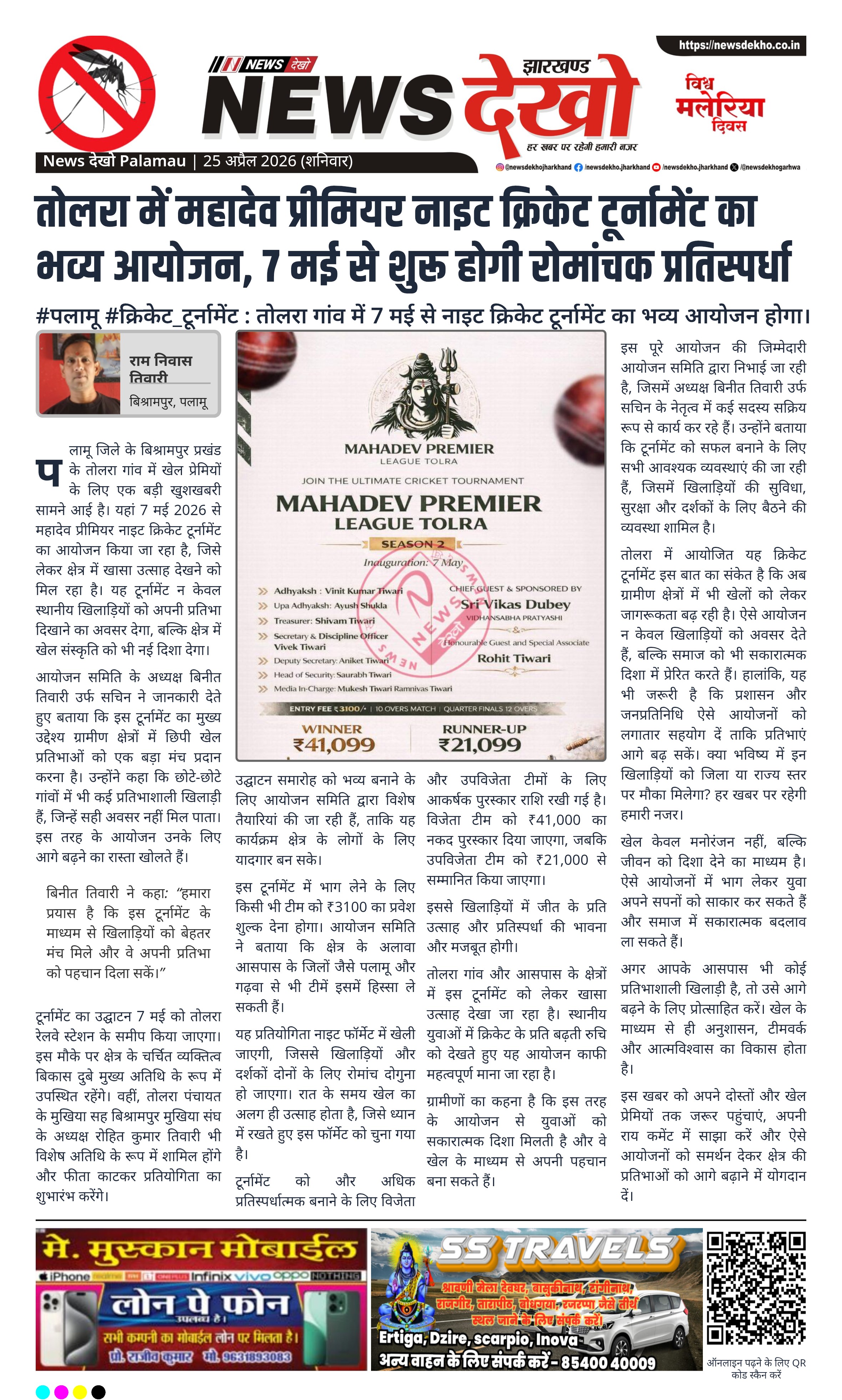 पलामू जिले के बिश्रामपुर प्रखंड के तोलरा गांव में खेल प्रेमियों के लिए एक बड़ी खुशखबरी सामने आई है। यहां 7 मई 2026 से महादेव प्रीमियर नाइट क्रिकेट टूर्नामेंट का आयोजन किया जा रहा है, जिसे लेकर क्षेत्र में खासा उत्साह देखने को मिल रहा है। यह टूर्नामेंट न केवल स्थानीय खिलाड़ियों को अपनी प्रतिभा दिखाने का अवसर देगा, बल्कि क्षेत्र में खेल संस्कृति को भी नई दिशा देगा।