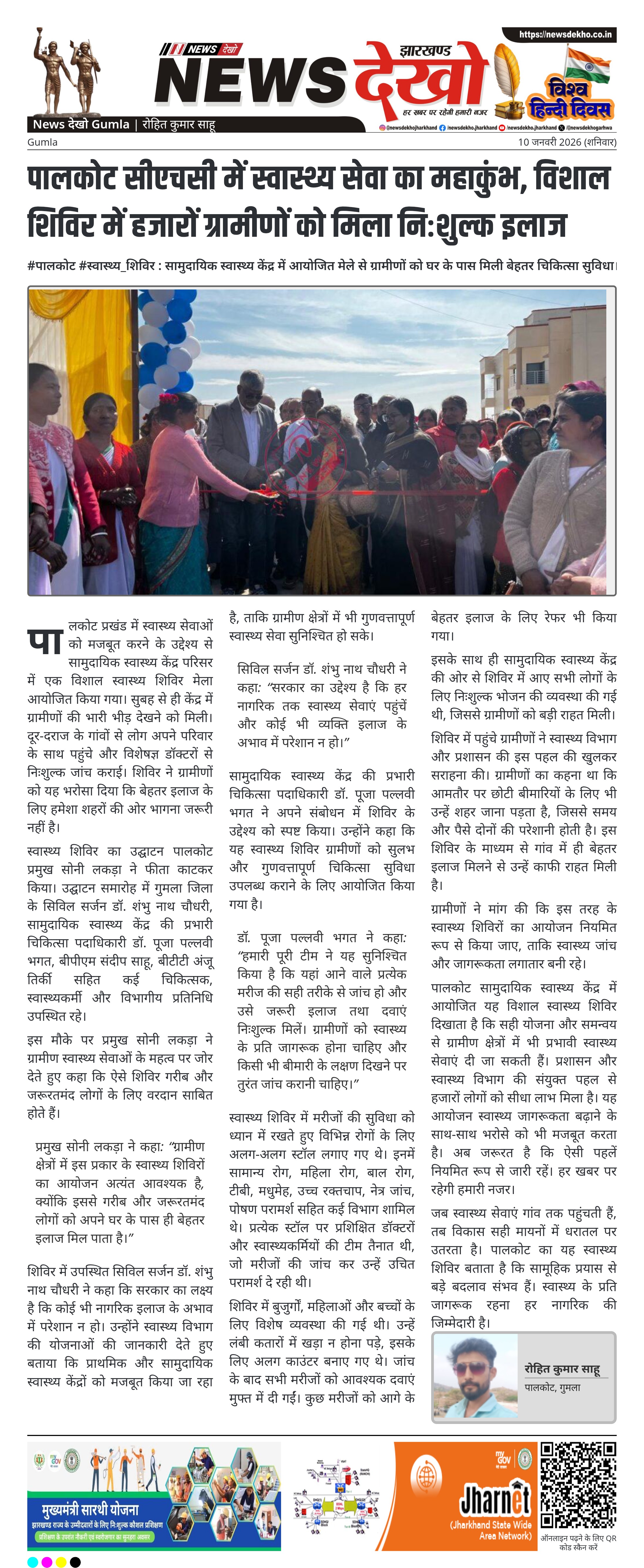 गुमला जिले के पालकोट सामुदायिक स्वास्थ्य केंद्र में आयोजित विशाल स्वास्थ्य शिविर मेला ग्रामीण स्वास्थ्य सेवाओं के विस्तार का बड़ा उदाहरण बना। शिविर का उद्घाटन पालकोट प्रमुख सोनी लकड़ा ने किया, जिसमें सिविल सर्जन डॉ. शंभु नाथ चौधरी सहित कई वरिष्ठ चिकित्सक और स्वास्थ्यकर्मी मौजूद रहे। इस शिविर में हजारों ग्रामीणों ने निःशुल्क जांच, दवा और परामर्श का लाभ उठाया। यह आयोजन दूरदराज के ग्रामीणों को सुलभ और गुणवत्तापूर्ण स्वास्थ्य सेवा उपलब्ध कराने की दिशा में महत्वपूर्ण कदम माना जा रहा है।