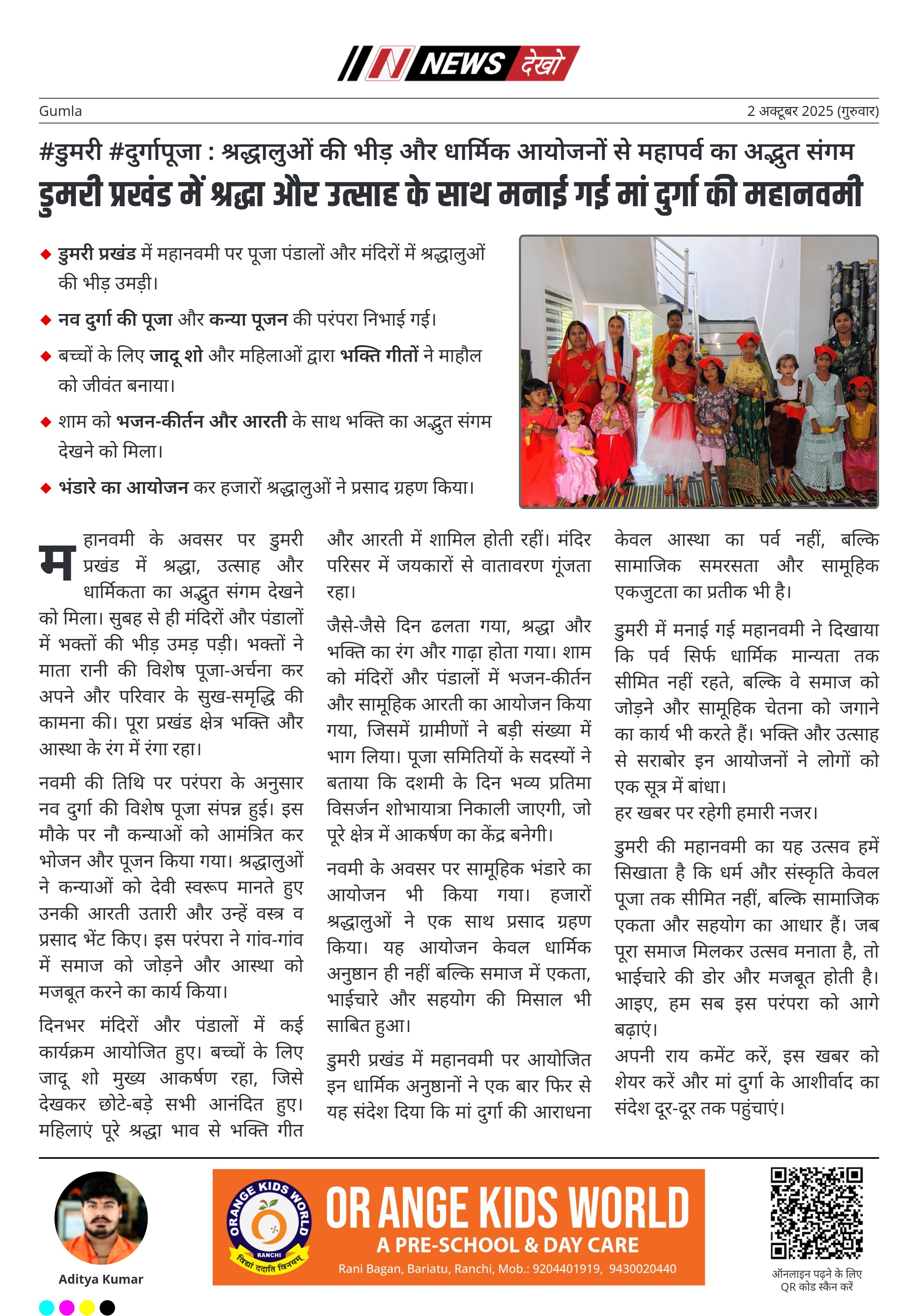 डुमरी में मनाई गई महानवमी ने दिखाया कि पर्व सिर्फ धार्मिक मान्यता तक सीमित नहीं रहते, बल्कि वे समाज को जोड़ने और सामूहिक चेतना को जगाने का कार्य भी करते हैं। भक्ति और उत्साह से सराबोर इन आयोजनों ने लोगों को एक सूत्र में बांधा।