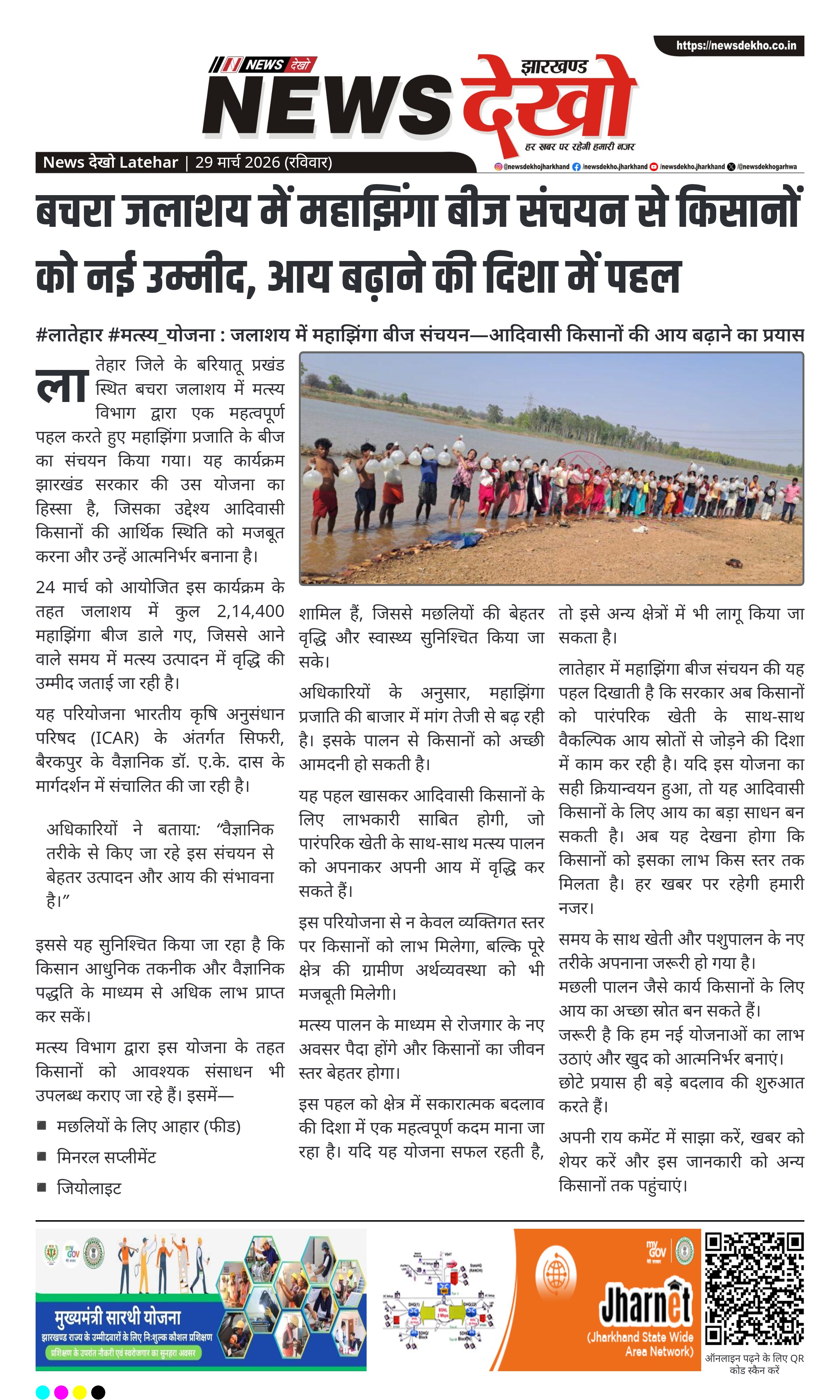 लातेहार जिले के बरियातू प्रखंड स्थित बचरा जलाशय में मत्स्य विभाग द्वारा महाझिंगा प्रजाति के बीज का संचयन किया गया। 24 मार्च को 2,14,400 बीज डाले गए। यह पहल झारखंड सरकार की योजना के तहत आदिवासी किसानों की आय बढ़ाने के उद्देश्य से की गई है। विशेषज्ञों के मार्गदर्शन में यह परियोजना संचालित होगी।