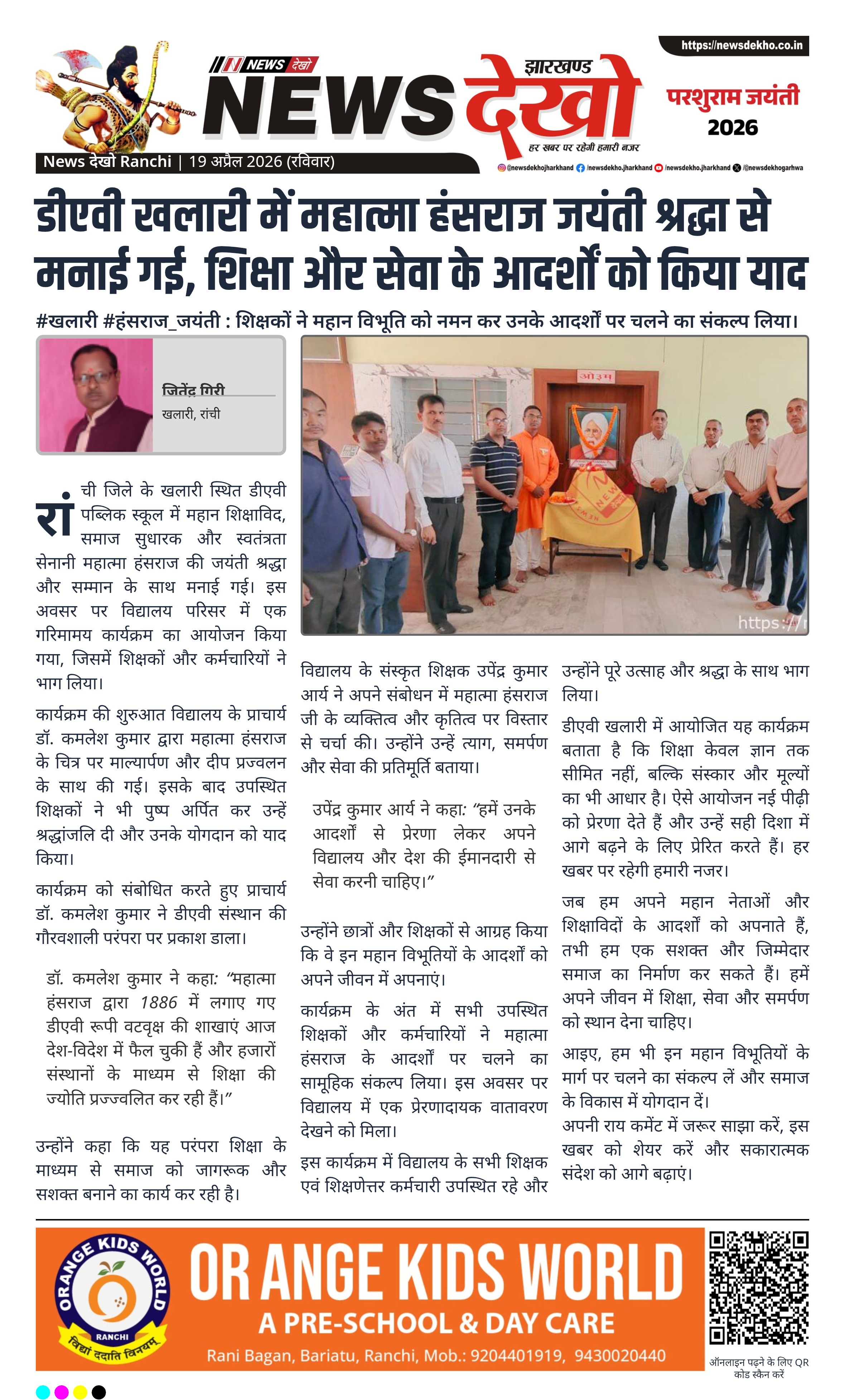 रांची के खलारी स्थित डीएवी पब्लिक स्कूल में महात्मा हंसराज जयंती श्रद्धा और सम्मान के साथ मनाई गई। प्राचार्य डॉ. कमलेश कुमार एवं शिक्षकों ने उनके चित्र पर माल्यार्पण कर श्रद्धांजलि दी। कार्यक्रम में शिक्षा और सेवा के आदर्शों पर चलने का संदेश दिया गया। सभी ने उनके विचारों को जीवन में अपनाने का संकल्प लिया।