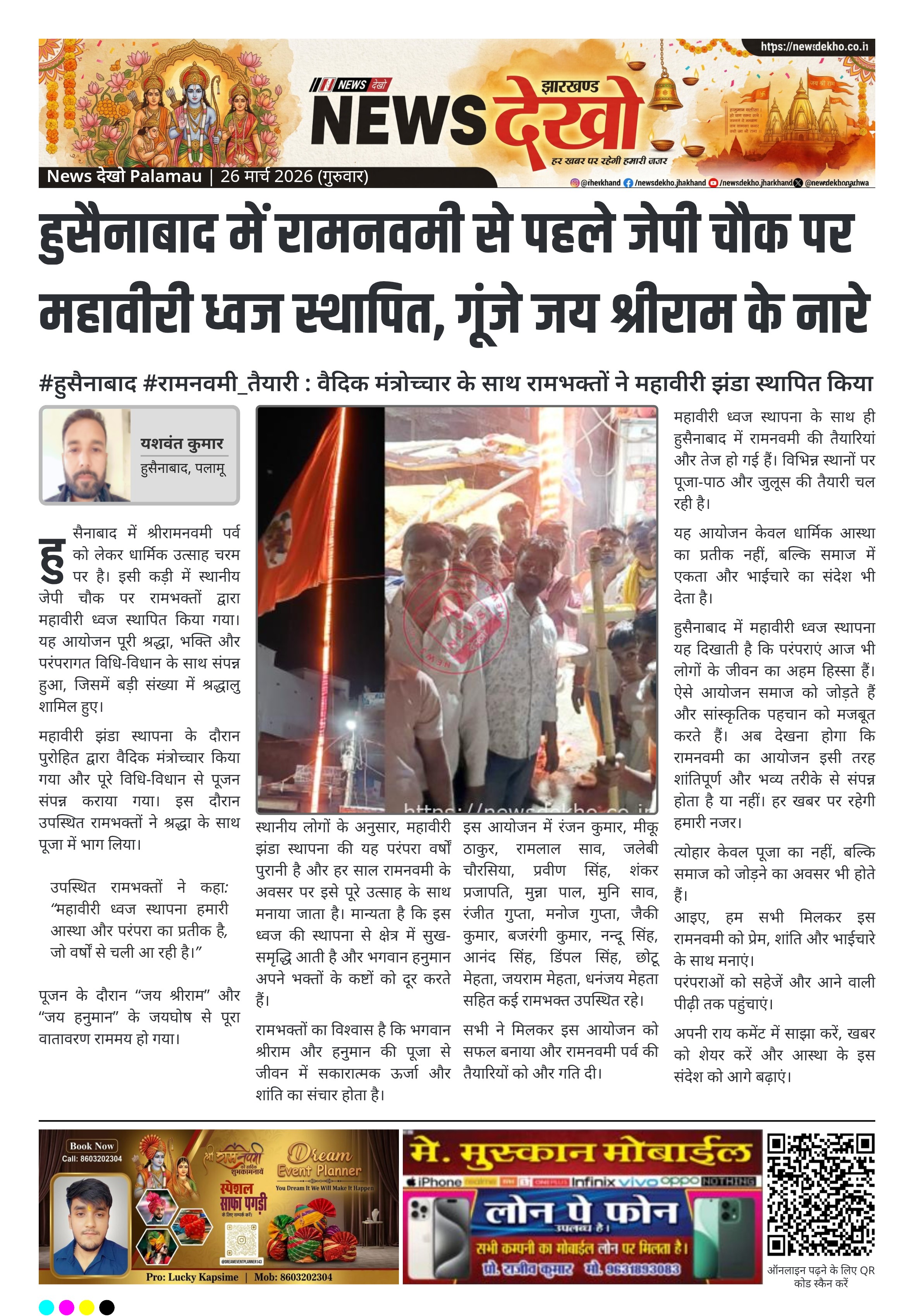 हुसैनाबाद में रामनवमी से पहले जेपी चौक पर महावीरी ध्वज स्थापित, गूंजे जय श्रीराम के नारे