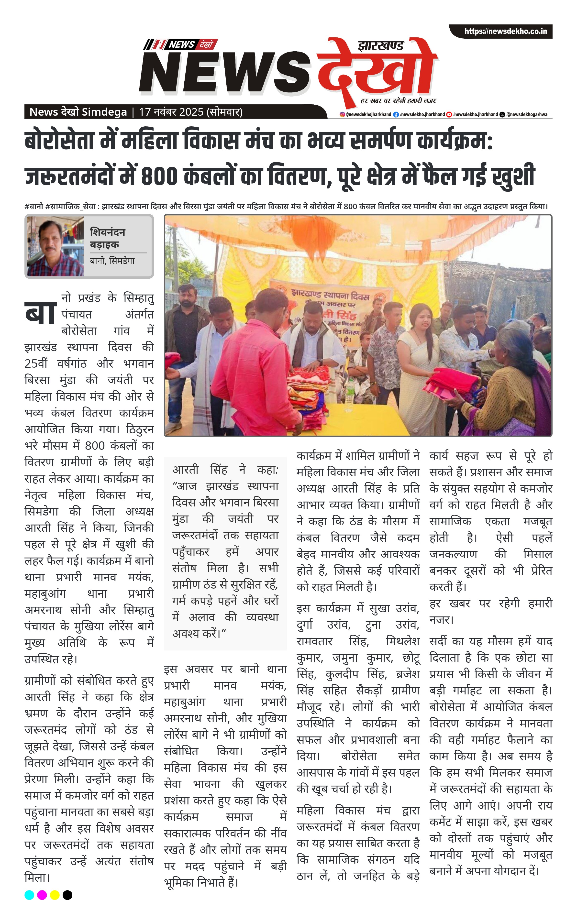 बानो प्रखंड के सिम्हातु पंचायत अंतर्गत बोरोसेता गांव में झारखंड स्थापना दिवस की 25वीं वर्षगांठ और भगवान बिरसा मुंडा की जयंती पर महिला विकास मंच की ओर से भव्य कंबल वितरण कार्यक्रम आयोजित किया गया। ठिठुरन भरे मौसम में 800 कंबलों का वितरण ग्रामीणों के लिए बड़ी राहत लेकर आया। कार्यक्रम का नेतृत्व महिला विकास मंच, सिमडेगा की जिला अध्यक्ष आरती सिंह ने किया, जिनकी पहल से पूरे क्षेत्र में खुशी की लहर फैल गई। कार्यक्रम में बानो थाना प्रभारी मानव मयंक, महाबुआंग थाना प्रभारी अमरनाथ सोनी और सिम्हातु पंचायत के मुखिया लोरेंस बागे मुख्य अतिथि के रूप में उपस्थित रहे।