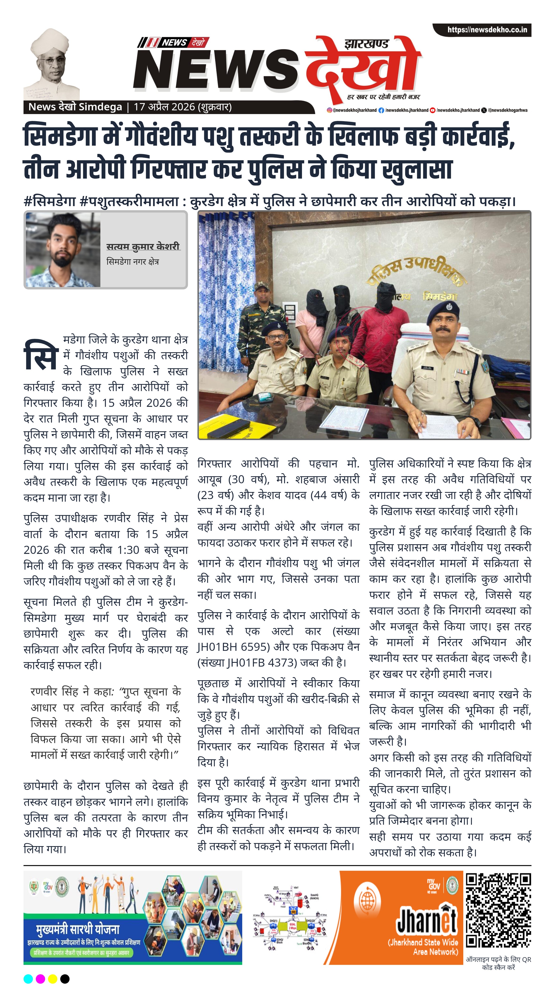 सिमडेगा जिले के कुरडेग थाना क्षेत्र में गौवंशीय पशुओं की तस्करी के खिलाफ पुलिस ने सख्त कार्रवाई करते हुए तीन आरोपियों को गिरफ्तार किया है। 15 अप्रैल 2026 की देर रात मिली गुप्त सूचना के आधार पर पुलिस ने छापेमारी की, जिसमें वाहन जब्त किए गए और आरोपियों को मौके से पकड़ लिया गया। पुलिस की इस कार्रवाई को अवैध तस्करी के खिलाफ एक महत्वपूर्ण कदम माना जा रहा है।