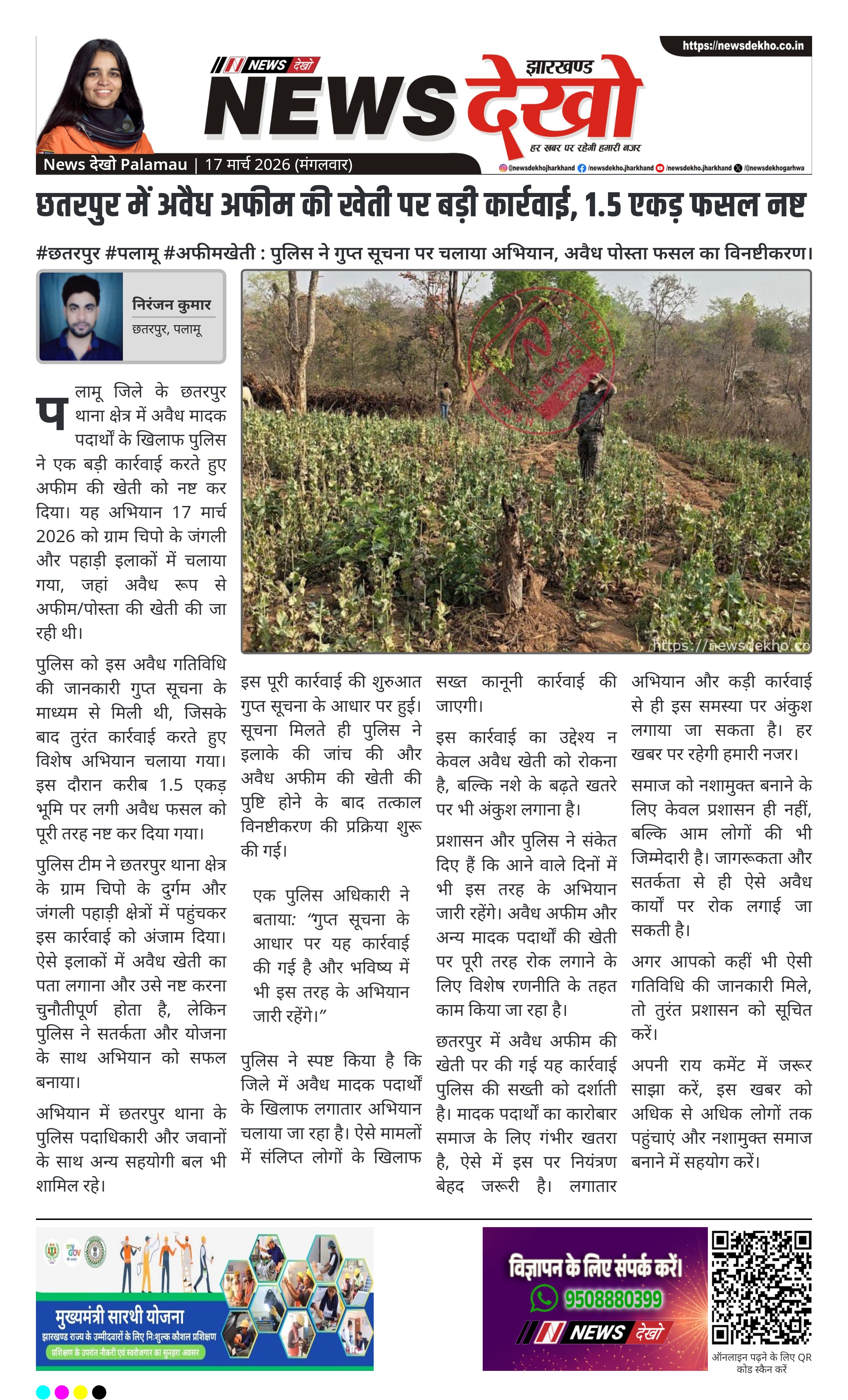पलामू जिले के छतरपुर थाना क्षेत्र में अवैध मादक पदार्थों के खिलाफ पुलिस ने एक बड़ी कार्रवाई करते हुए अफीम की खेती को नष्ट कर दिया। यह अभियान 17 मार्च 2026 को ग्राम चिपो के जंगली और पहाड़ी इलाकों में चलाया गया, जहां अवैध रूप से अफीम/पोस्ता की खेती की जा रही थी।