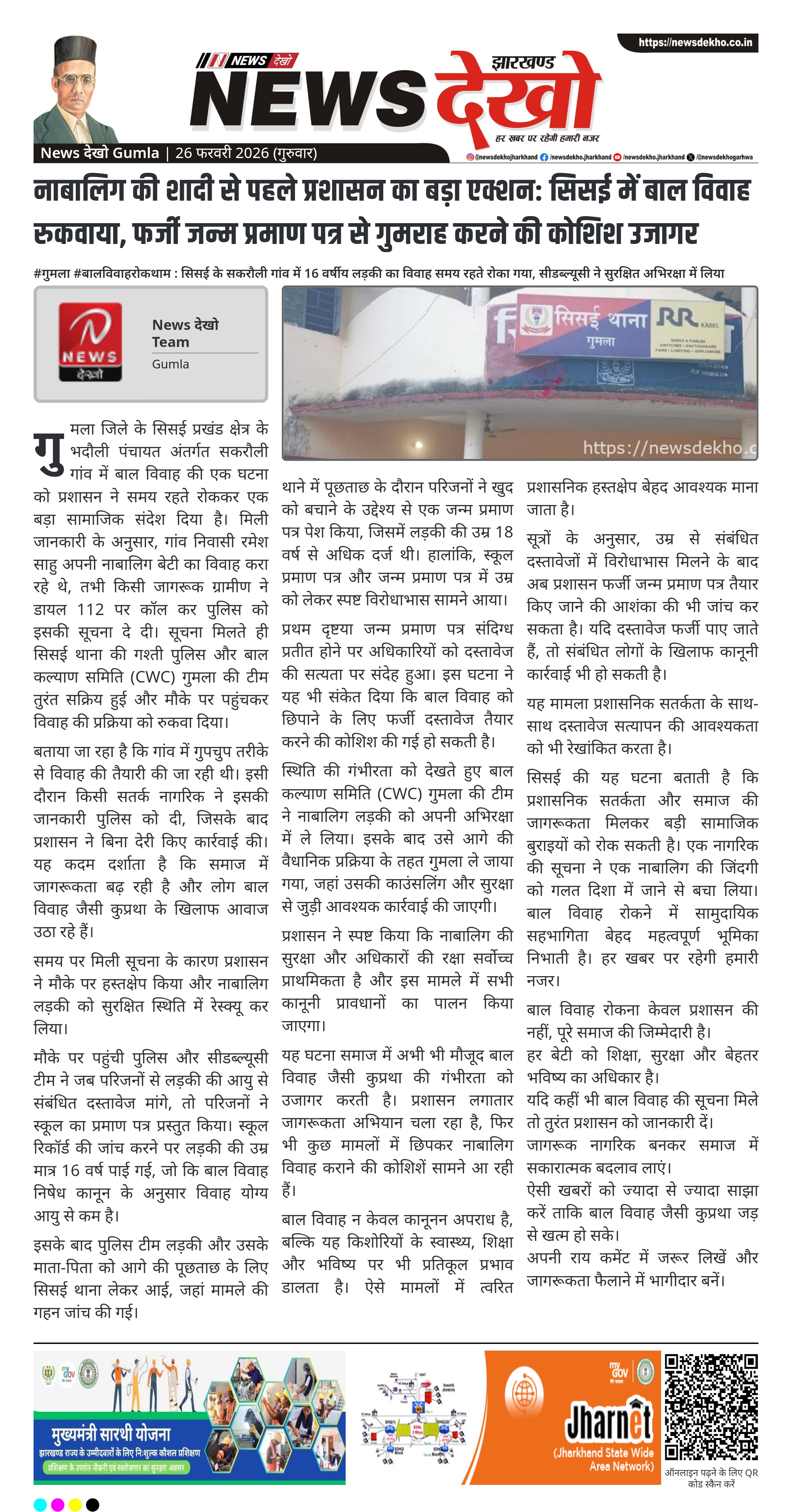 - सिसई प्रखंड के सकरौली गांव में 16 वर्षीय नाबालिग का विवाह रुकवाया गया।