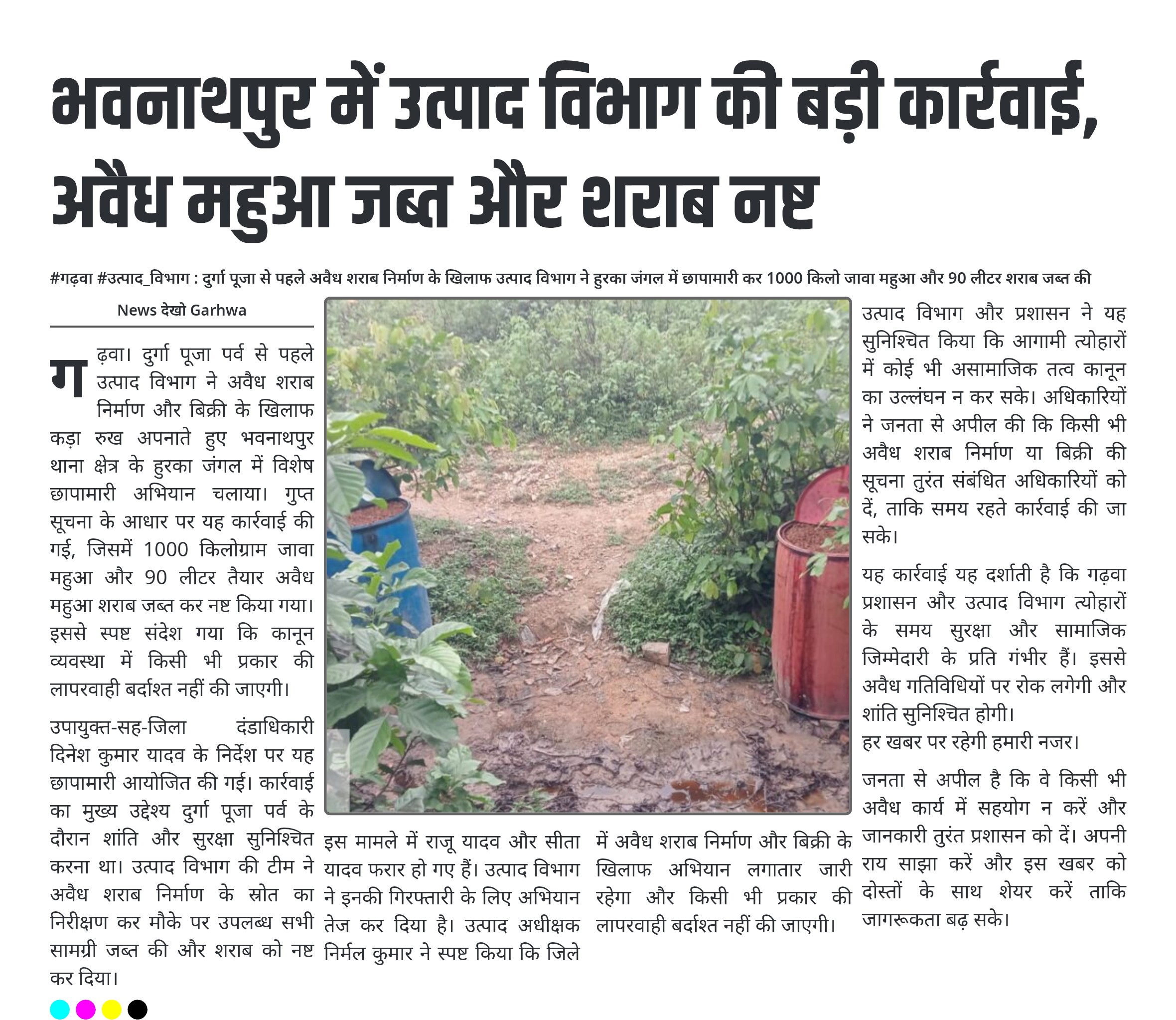 - उपायुक्त-सह-जिला दंडाधिकारी दिनेश कुमार यादव के निर्देश पर उत्पाद विभाग ने भवनाथपुर थाना क्षेत्र के हुरका जंगल में छापामारी की।