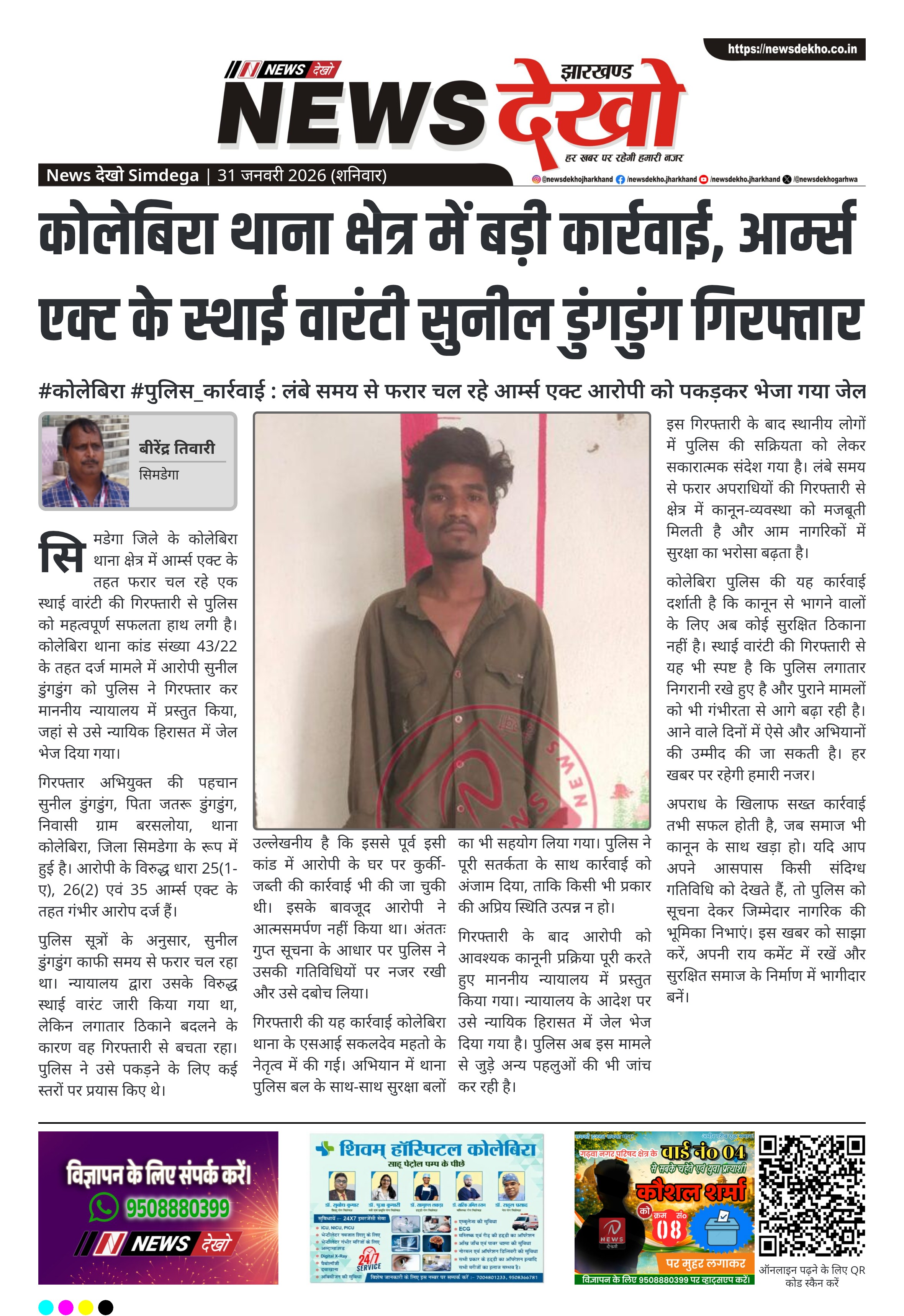 सिमडेगा जिले के कोलेबिरा थाना क्षेत्र में आर्म्स एक्ट के तहत फरार चल रहे एक स्थाई वारंटी की गिरफ्तारी से पुलिस को महत्वपूर्ण सफलता हाथ लगी है। कोलेबिरा थाना कांड संख्या 43/22 के तहत दर्ज मामले में आरोपी सुनील डुंगडुंग को पुलिस ने गिरफ्तार कर माननीय न्यायालय में प्रस्तुत किया, जहां से उसे न्यायिक हिरासत में जेल भेज दिया गया।