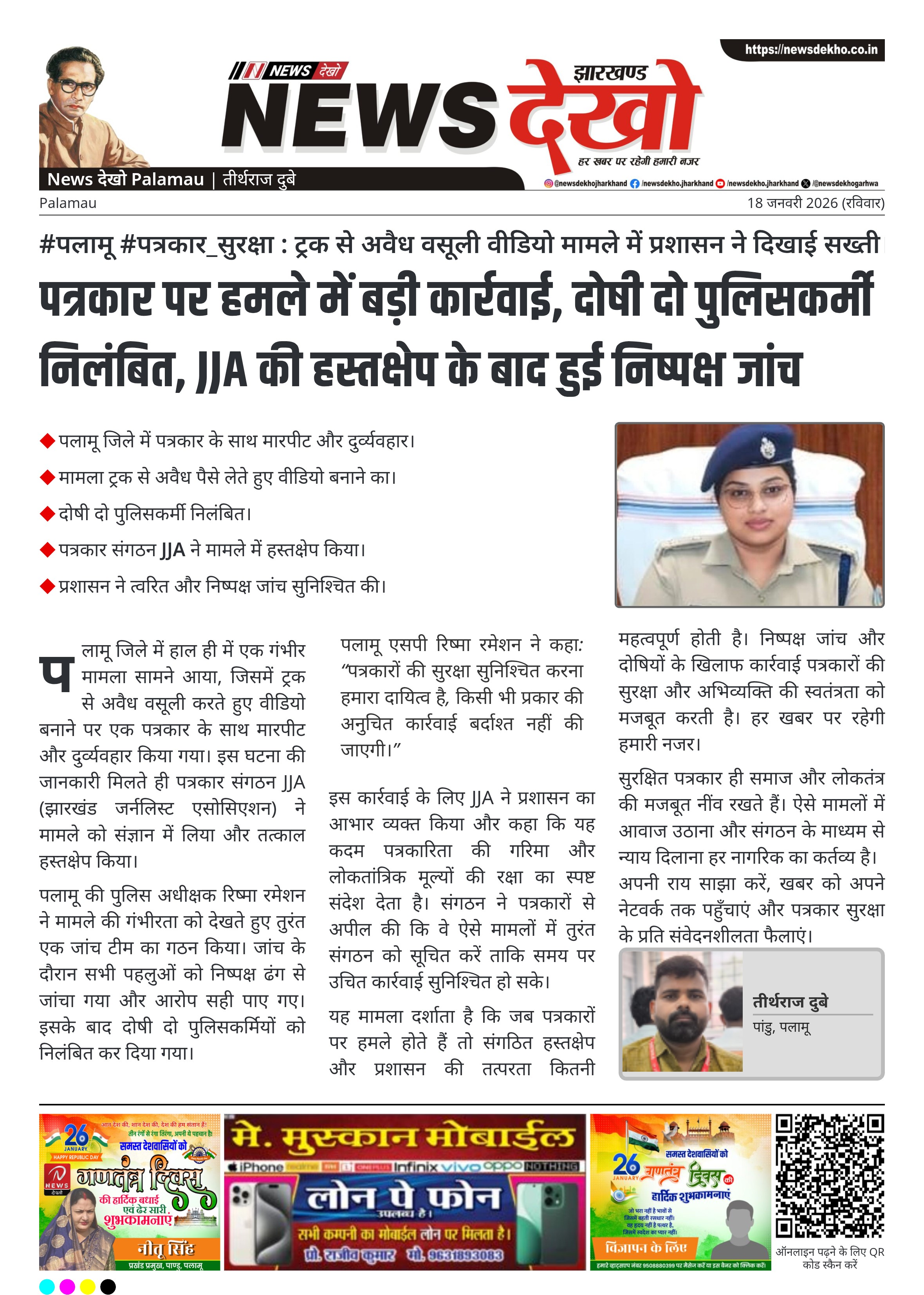 पलामू एसपी रिष्मा रमेशन ने कहा: “पत्रकारों की सुरक्षा सुनिश्चित करना हमारा दायित्व है, किसी भी प्रकार की अनुचित कार्रवाई बर्दाश्त नहीं की जाएगी।”