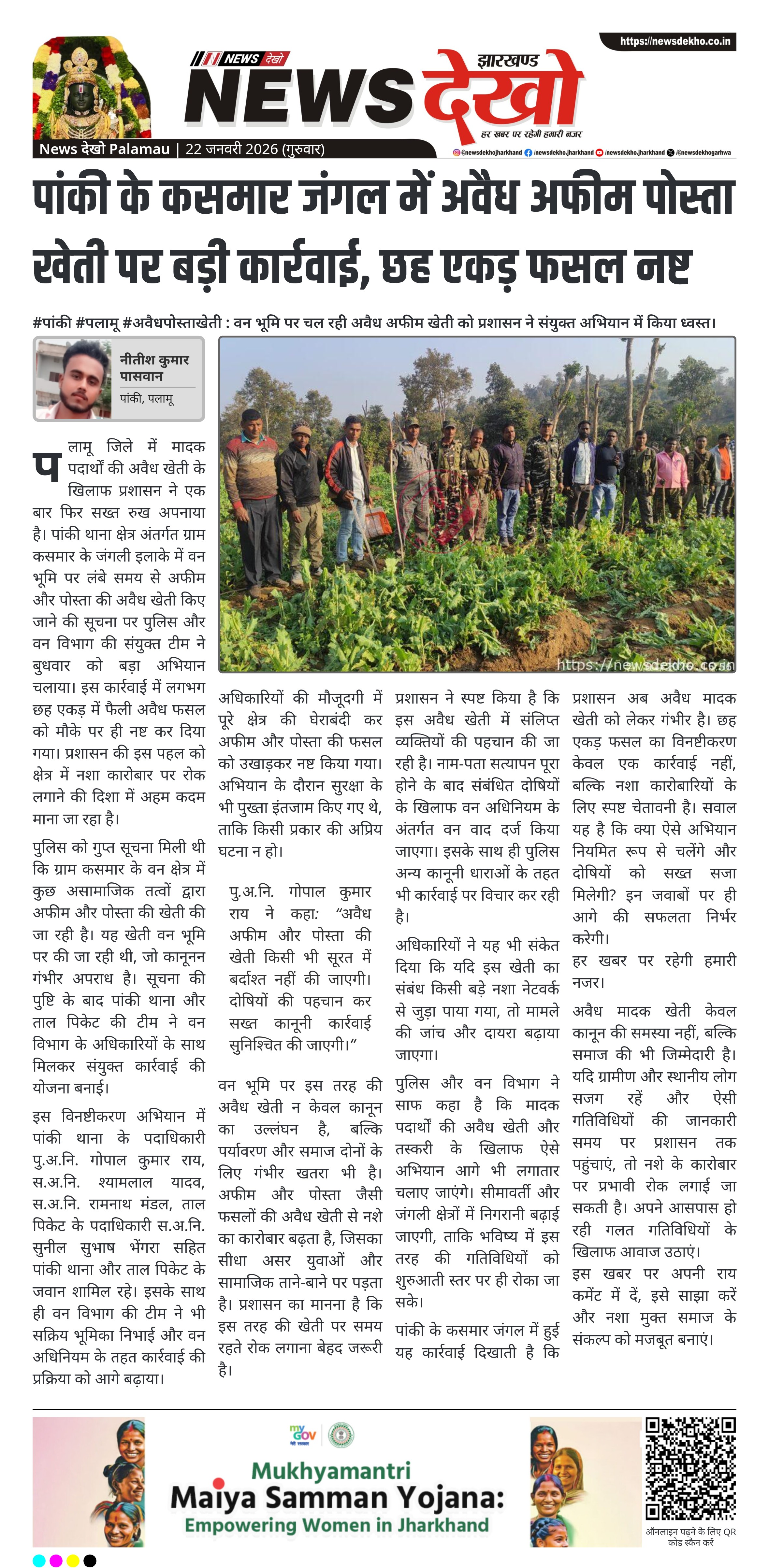 पलामू जिले में मादक पदार्थों की अवैध खेती के खिलाफ प्रशासन ने एक बार फिर सख्त रुख अपनाया है। पांकी थाना क्षेत्र अंतर्गत ग्राम कसमार के जंगली इलाके में वन भूमि पर लंबे समय से अफीम और पोस्ता की अवैध खेती किए जाने की सूचना पर पुलिस और वन विभाग की संयुक्त टीम ने बुधवार को बड़ा अभियान चलाया। इस कार्रवाई में लगभग छह एकड़ में फैली अवैध फसल को मौके पर ही नष्ट कर दिया गया। प्रशासन की इस पहल को क्षेत्र में नशा कारोबार पर रोक लगाने की दिशा में अहम कदम माना जा रहा है।