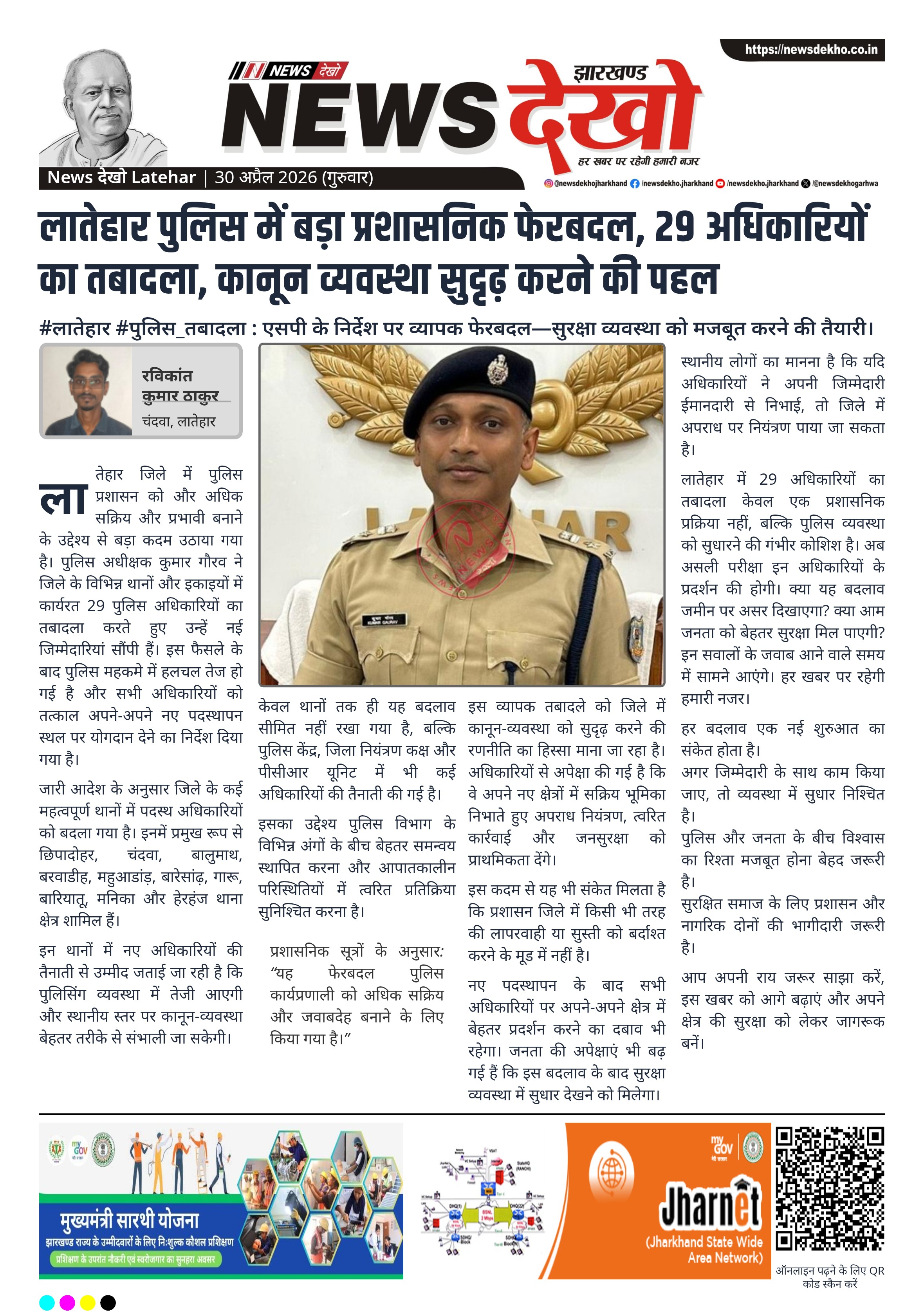- लातेहार में पुलिस विभाग में बड़ा प्रशासनिक फेरबदल।
