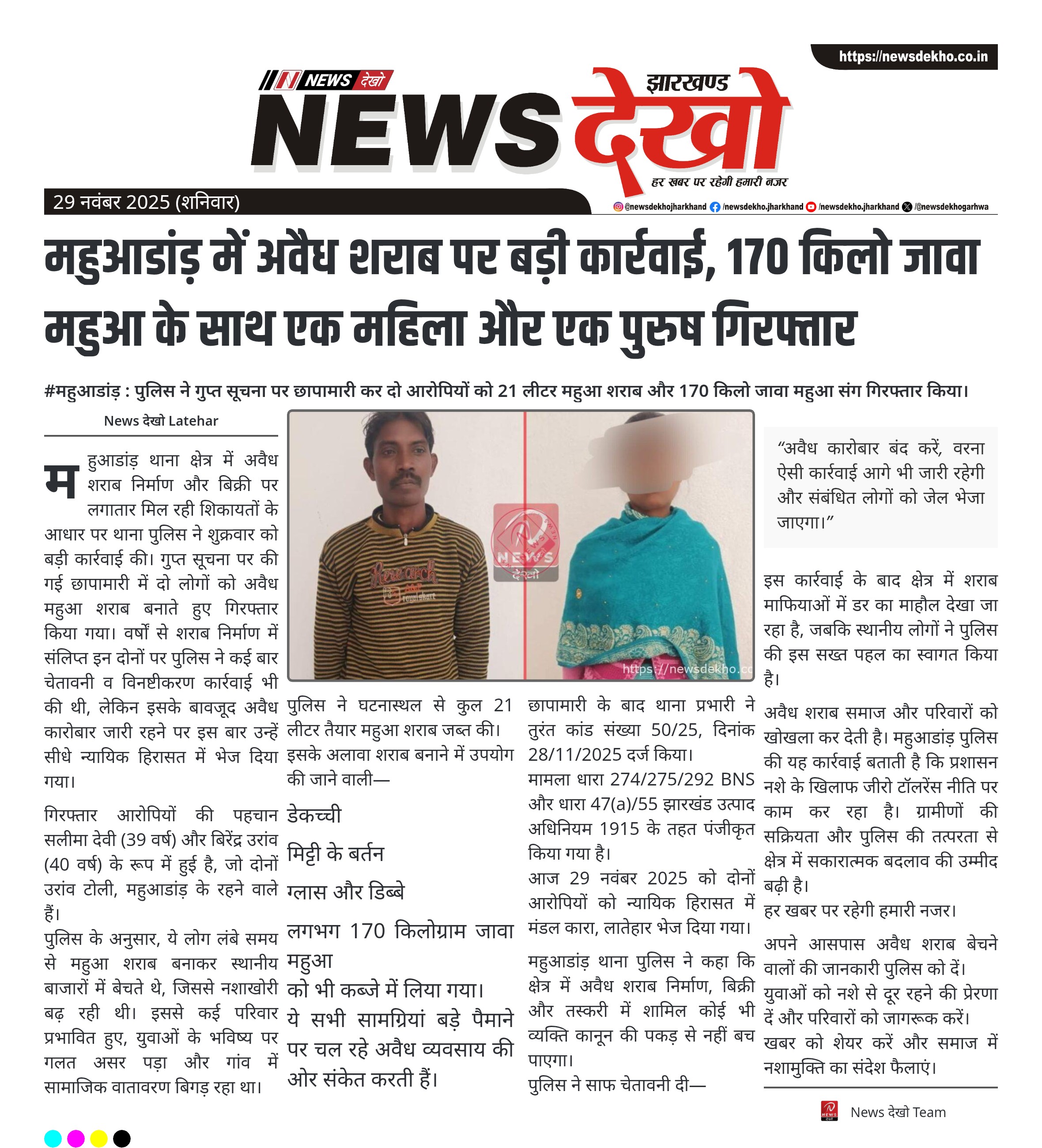 अवैध शराब समाज और परिवारों को खोखला कर देती है। महुआडांड़ पुलिस की यह कार्रवाई बताती है कि प्रशासन नशे के खिलाफ जीरो टॉलरेंस नीति पर काम कर रहा है। ग्रामीणों की सक्रियता और पुलिस की तत्परता से क्षेत्र में सकारात्मक बदलाव की उम्मीद बढ़ी है।