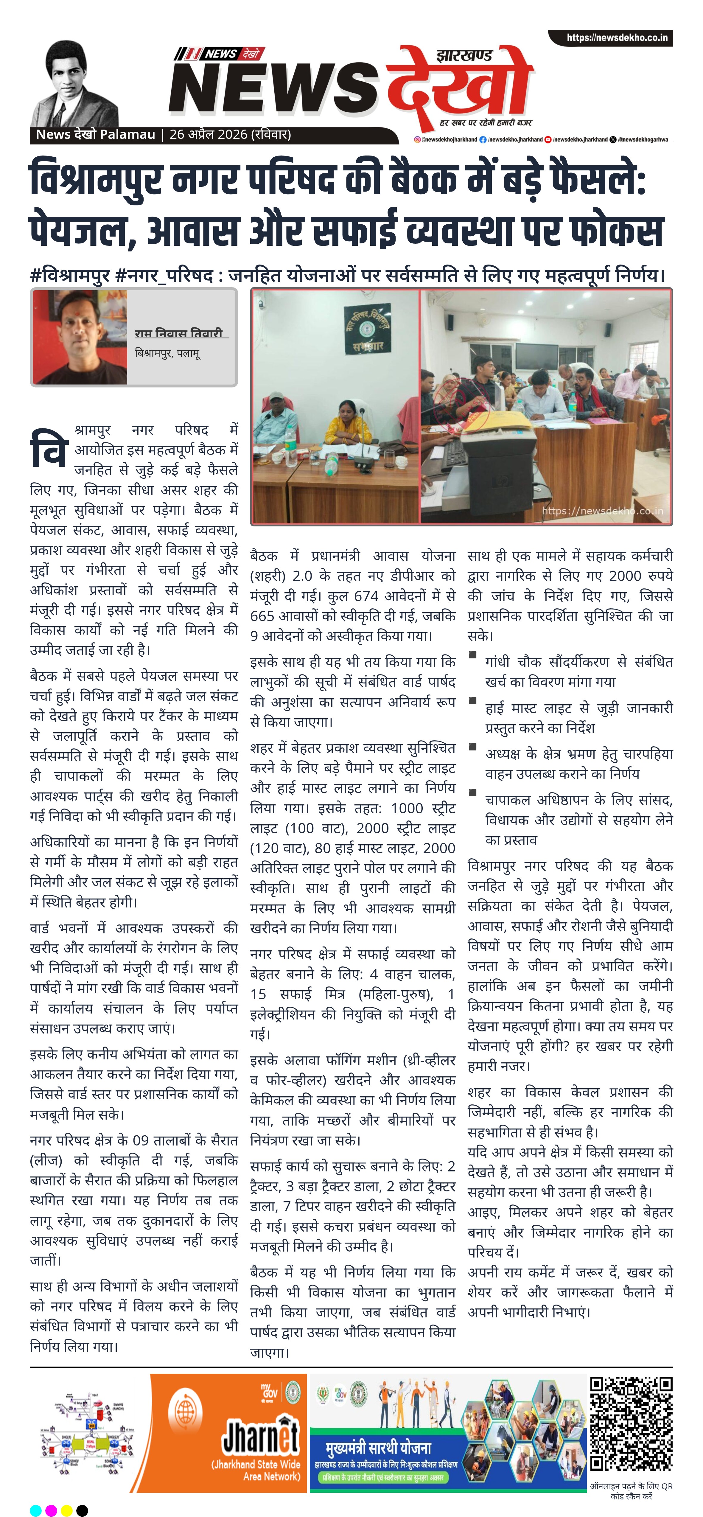 पलामू जिले के विश्रामपुर नगर परिषद सभागार में 25 अप्रैल 2026 को अहम बैठक आयोजित हुई। इसमें जनप्रतिनिधियों और अधिकारियों ने पेयजल, आवास, सफाई व विकास योजनाओं पर व्यापक चर्चा की। कई महत्वपूर्ण प्रस्तावों को सर्वसम्मति से मंजूरी दी गई। बैठक में नगर विकास को गति देने के लिए ठोस निर्णय लिए गए।