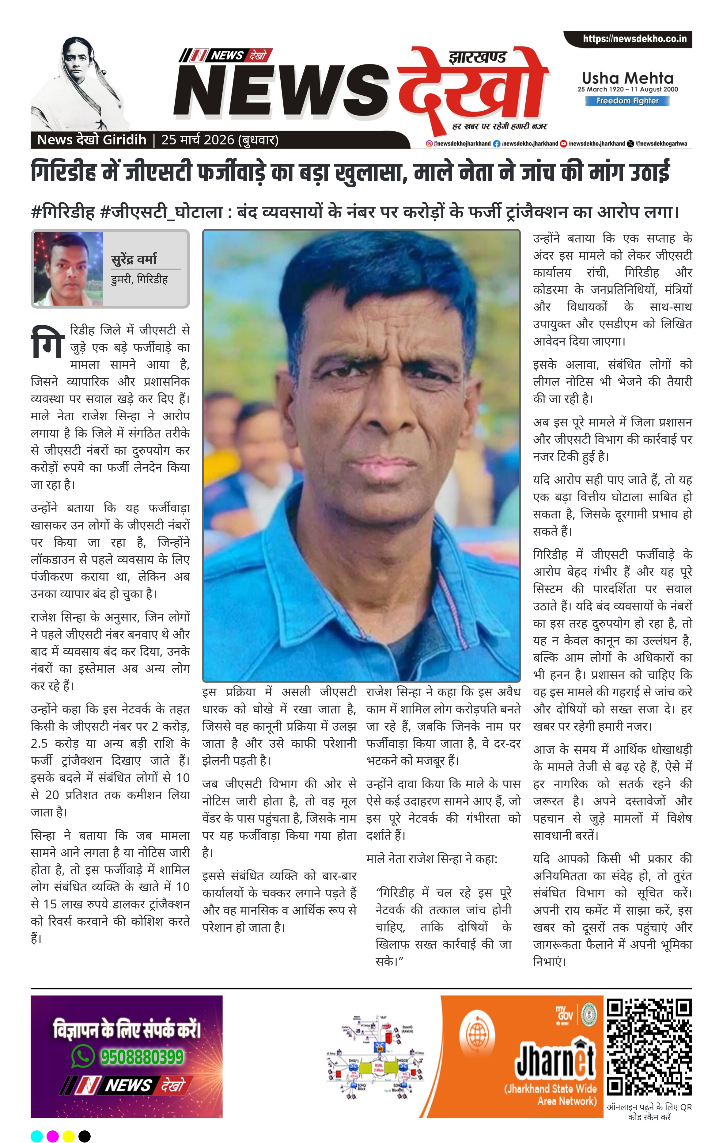 - राजेश सिन्हा ने जीएसटी फर्जीवाड़े का मुद्दा उठाया।