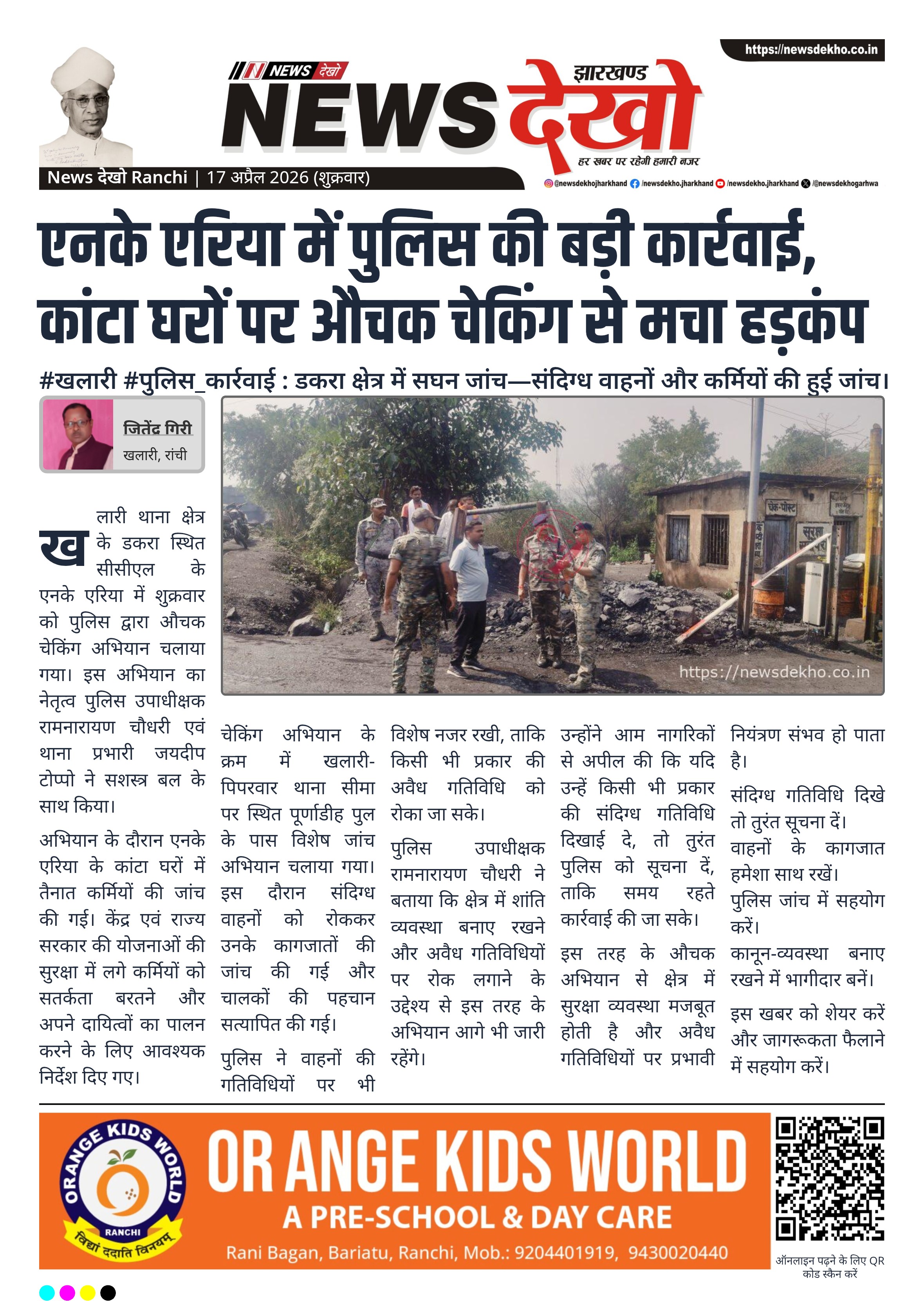 खलारी थाना क्षेत्र के डकरा स्थित सीसीएल के एनके एरिया में शुक्रवार को पुलिस द्वारा औचक चेकिंग अभियान चलाया गया। इस अभियान का नेतृत्व पुलिस उपाधीक्षक रामनारायण चौधरी एवं थाना प्रभारी जयदीप टोप्पो ने सशस्त्र बल के साथ किया।