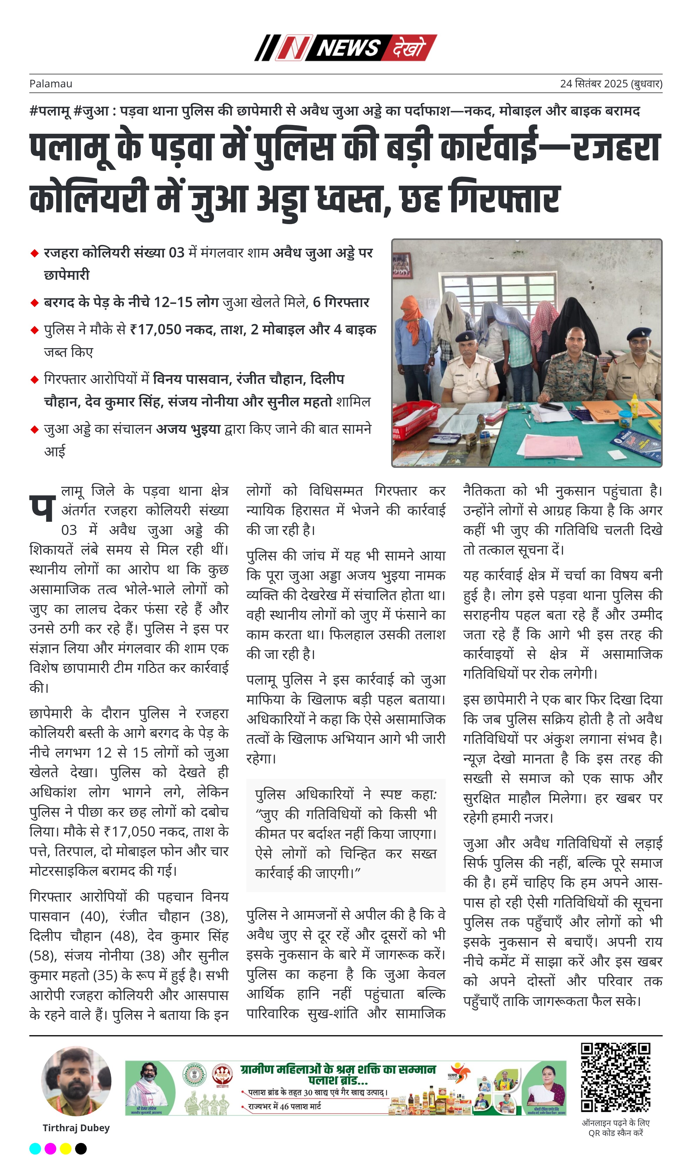 #पलामू #जुआ : पड़वा थाना पुलिस की छापेमारी से अवैध जुआ अड्डे का पर्दाफाश—नकद, मोबाइल और बाइक बरामद