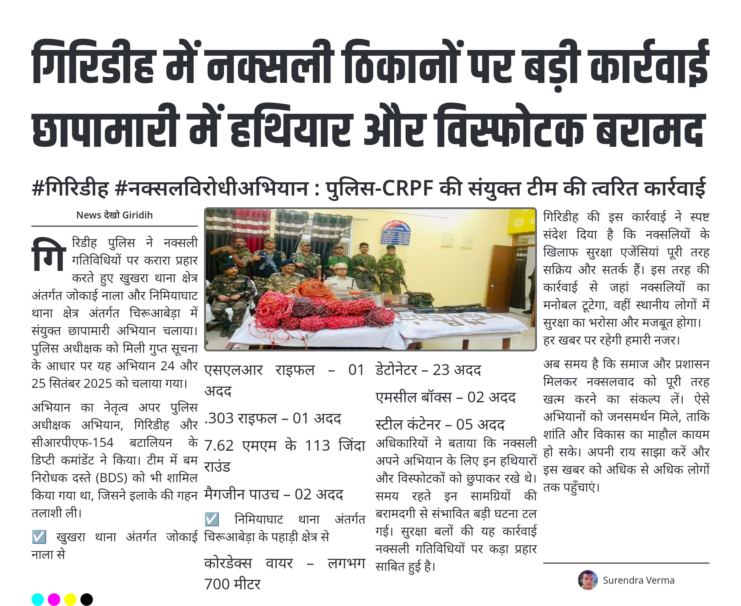 - पुलिस अधीक्षक गिरिडीह और CRPF-154 बटालियन की संयुक्त कार्रवाई।