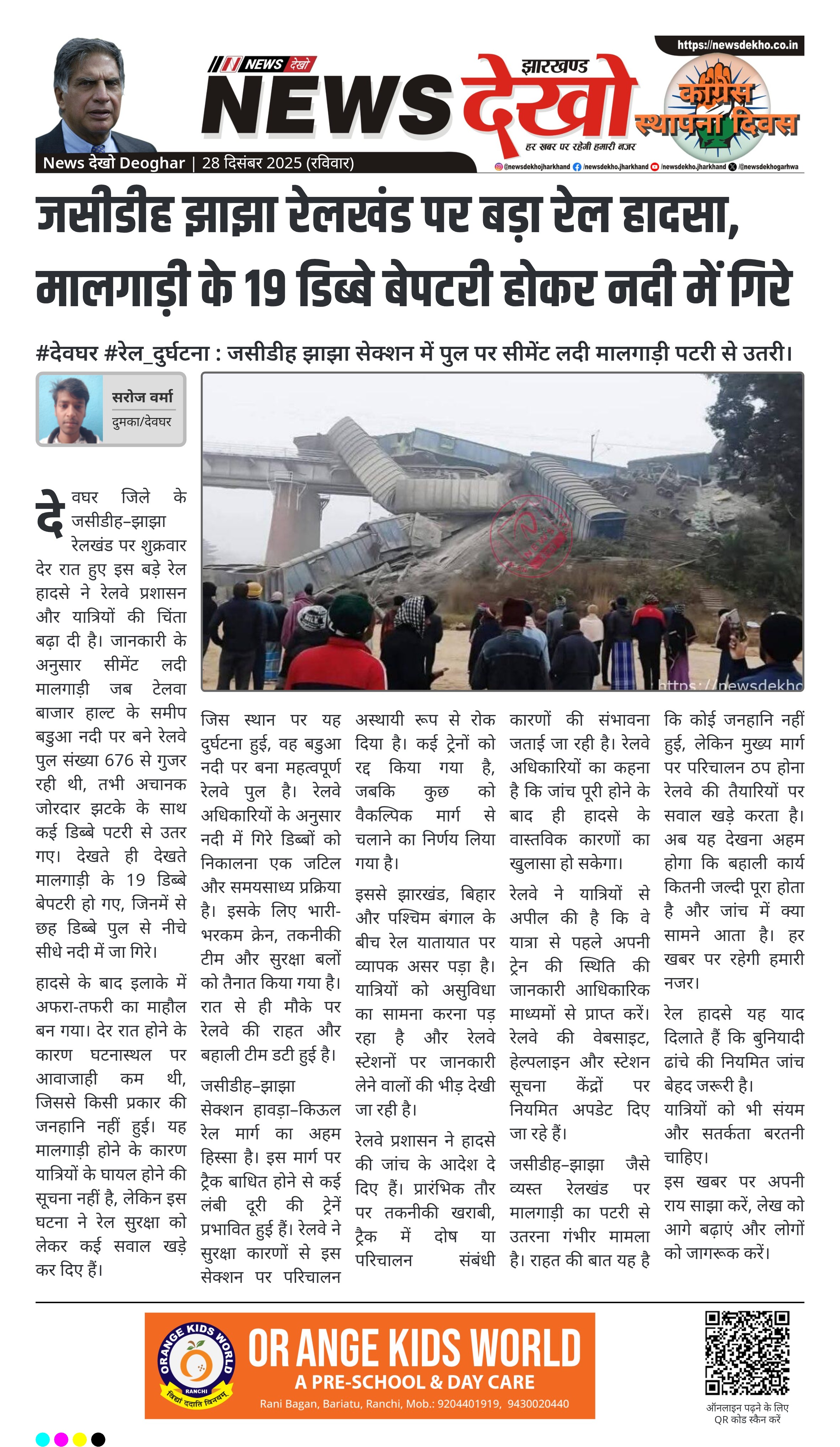 देवघर जिले के जसीडीह झाझा रेलखंड पर 27 दिसंबर की रात एक गंभीर रेल हादसा हुआ, जिससे हावड़ा किऊल मुख्य रेल मार्ग पर परिचालन ठप हो गया। टेलवा बाजार हाल्ट के पास बडुआ नदी पर बने रेलवे पुल पर सीमेंट लदी मालगाड़ी पटरी से उतर गई। हादसे में कुल 19 डिब्बे बेपटरी हो गए, जिनमें से छह डिब्बे नदी में जा गिरे। घटना के बाद रेलवे प्रशासन ने ट्रैक बहाली और जांच की प्रक्रिया शुरू कर दी है।