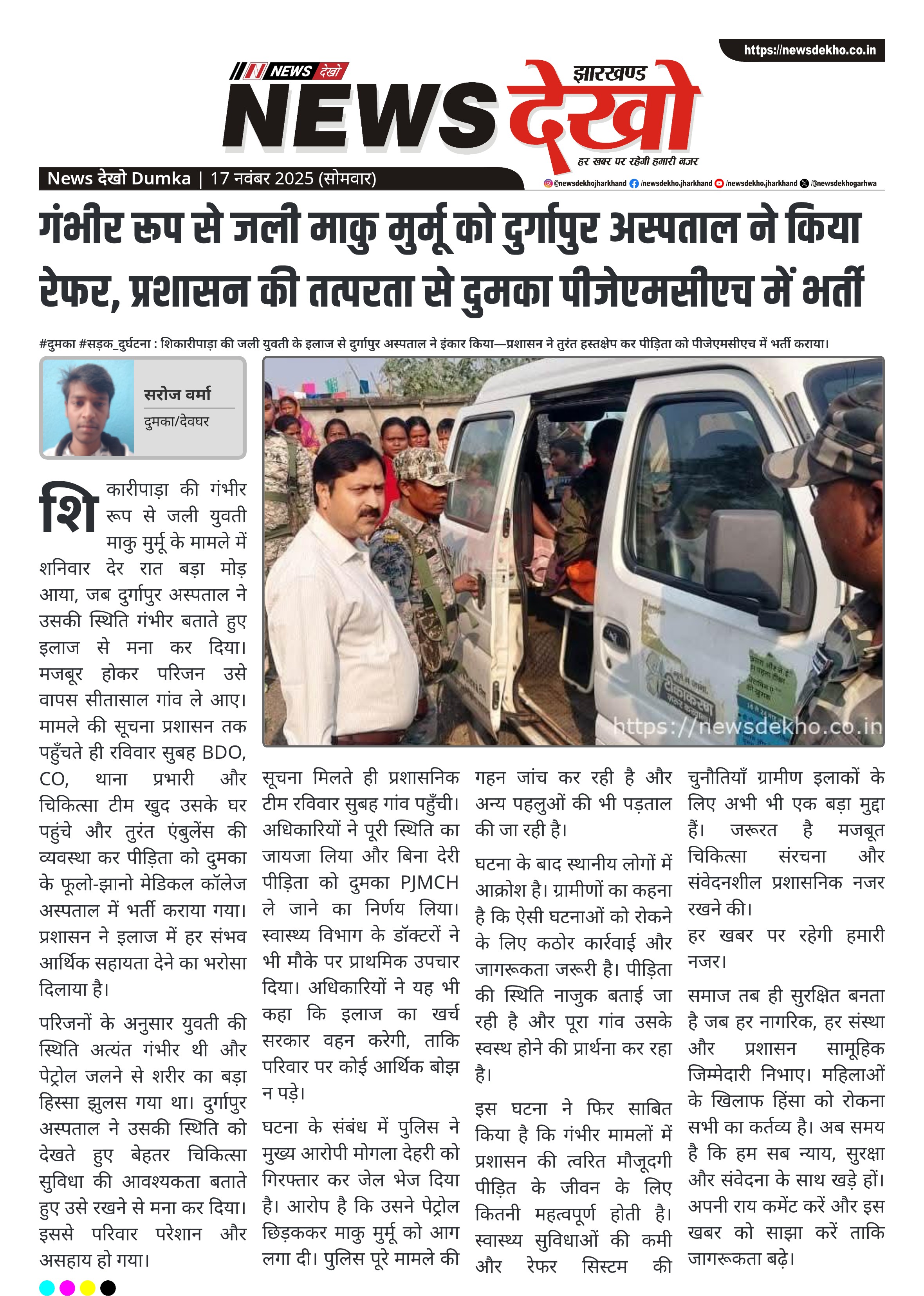 #दुमका #सड़क_दुर्घटना : शिकारीपाड़ा की जली युवती के इलाज से दुर्गापुर अस्पताल ने इंकार किया—प्रशासन ने तुरंत हस्तक्षेप कर पीड़िता को पीजेएमसीएच में भर्ती कराया।