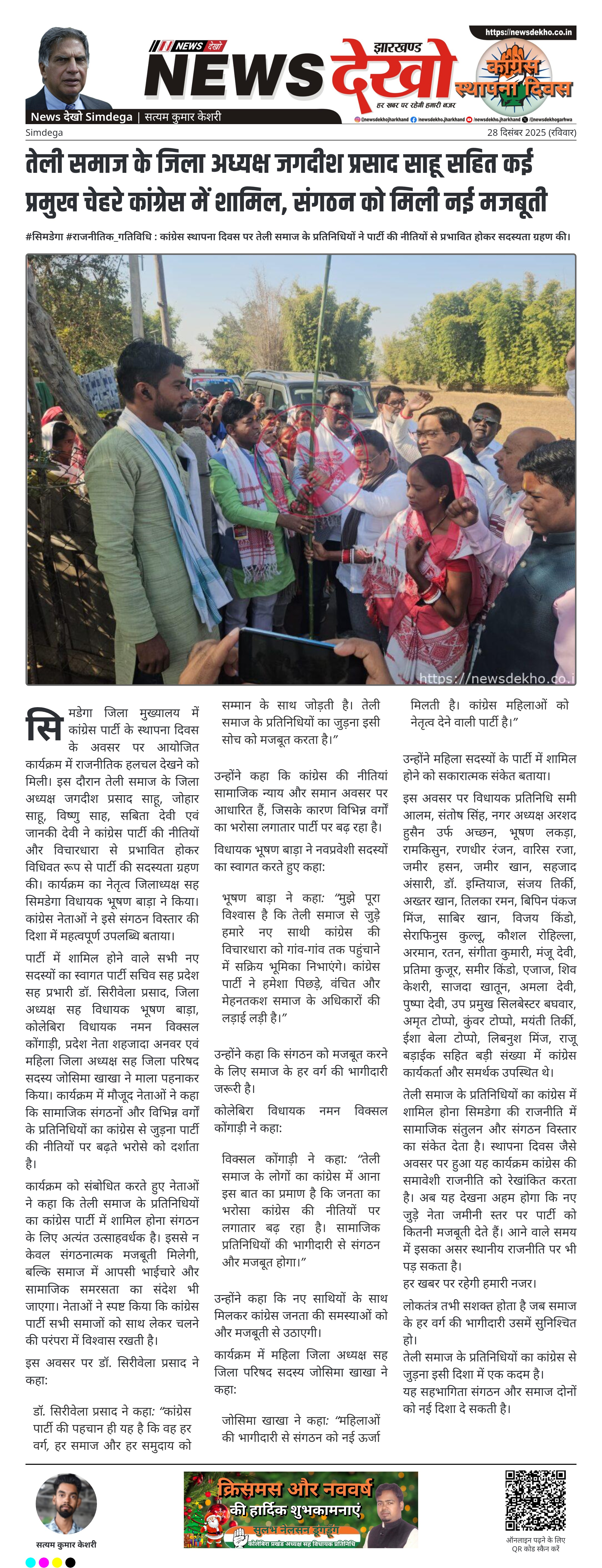 सिमडेगा जिला मुख्यालय में कांग्रेस पार्टी के स्थापना दिवस के अवसर पर आयोजित कार्यक्रम में राजनीतिक हलचल देखने को मिली। इस दौरान तेली समाज के जिला अध्यक्ष जगदीश प्रसाद साहू, जोहार साहू, विष्णु साह, सबिता देवी एवं जानकी देवी ने कांग्रेस पार्टी की नीतियों और विचारधारा से प्रभावित होकर विधिवत रूप से पार्टी की सदस्यता ग्रहण की। कार्यक्रम का नेतृत्व जिलाध्यक्ष सह सिमडेगा विधायक भूषण बाड़ा ने किया। कांग्रेस नेताओं ने इसे संगठन विस्तार की दिशा में महत्वपूर्ण उपलब्धि बताया।