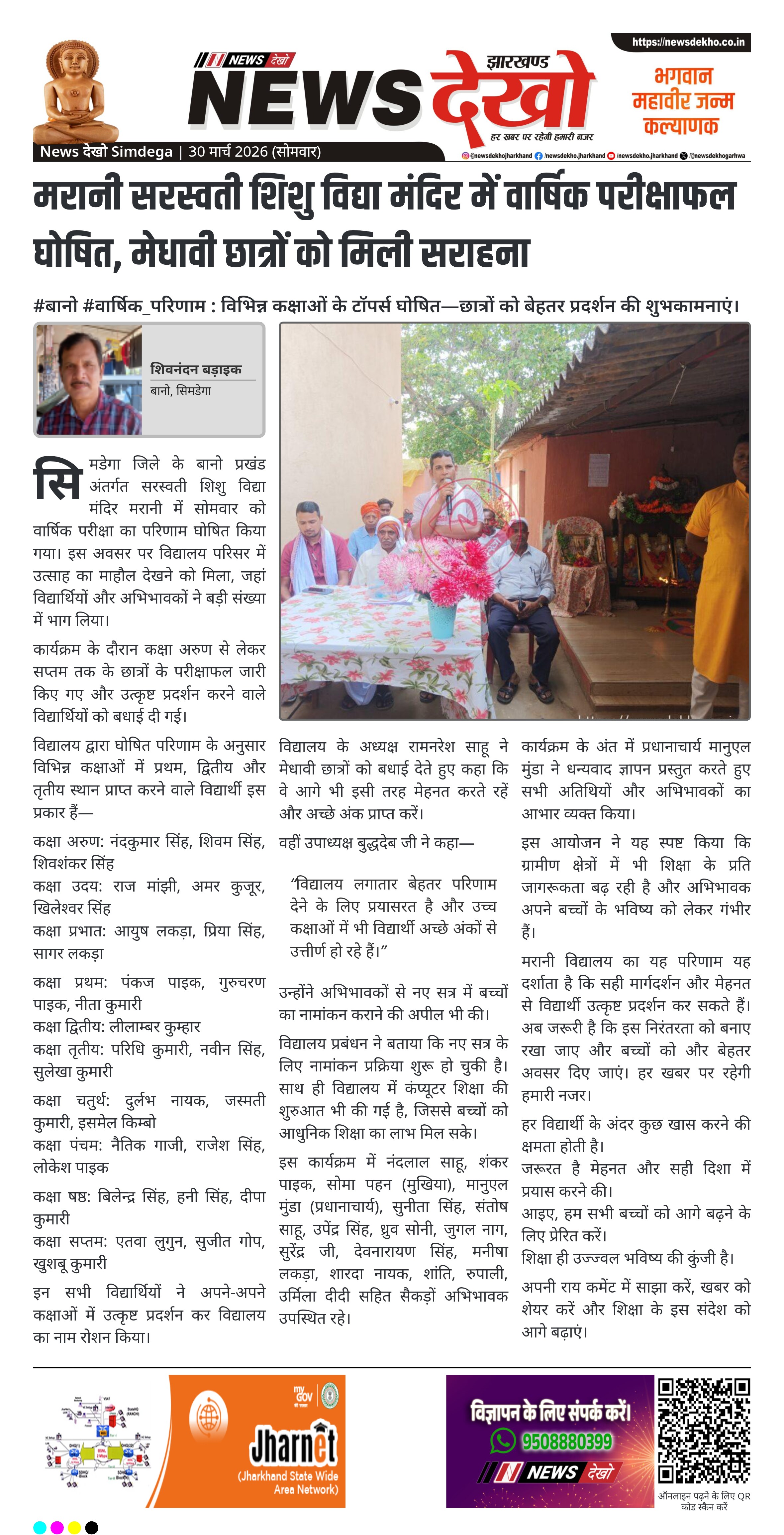 सिमडेगा जिले के बानो प्रखंड स्थित सरस्वती शिशु विद्या मंदिर मरानी में वार्षिक परीक्षाफल घोषित किया गया। कार्यक्रम में कक्षा अरुण से सप्तम तक के छात्रों के परिणाम जारी किए गए। मेधावी विद्यार्थियों को बधाई दी गई और नए सत्र के लिए प्रेरित किया गया। बड़ी संख्या में अभिभावक और शिक्षक इस अवसर पर उपस्थित रहे।