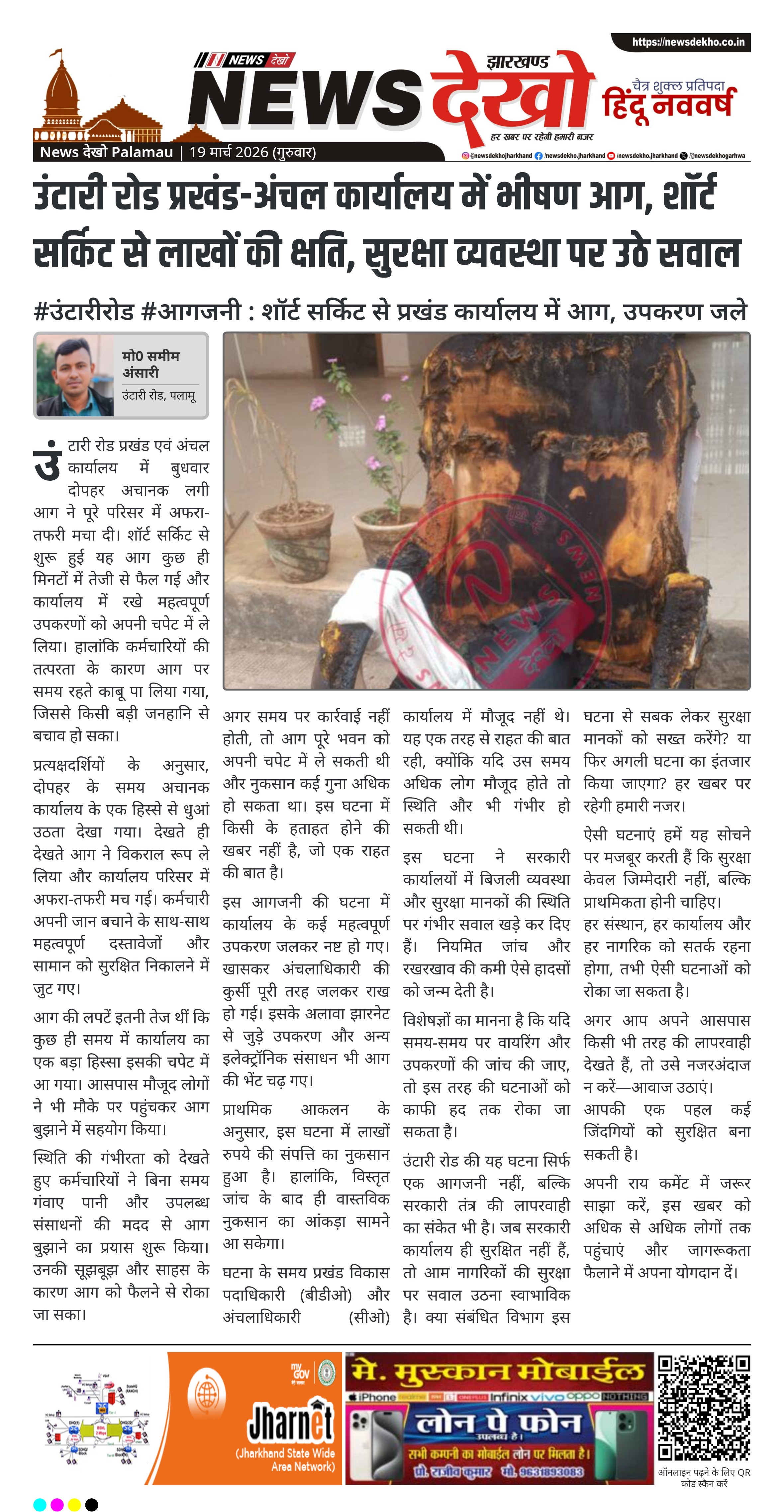 पलामू के उंटारी रोड स्थित प्रखंड एवं अंचल कार्यालय में बुधवार दोपहर शॉर्ट सर्किट से आग लग गई, जिससे लाखों रुपये की संपत्ति जलकर नष्ट हो गई। घटना के समय अधिकारी कार्यालय में मौजूद नहीं थे, जिससे जनहानि टल गई। कर्मचारियों की तत्परता से आग पर काबू पाया गया। इस घटना ने सरकारी कार्यालयों की सुरक्षा व्यवस्था पर गंभीर सवाल खड़े कर दिए हैं।