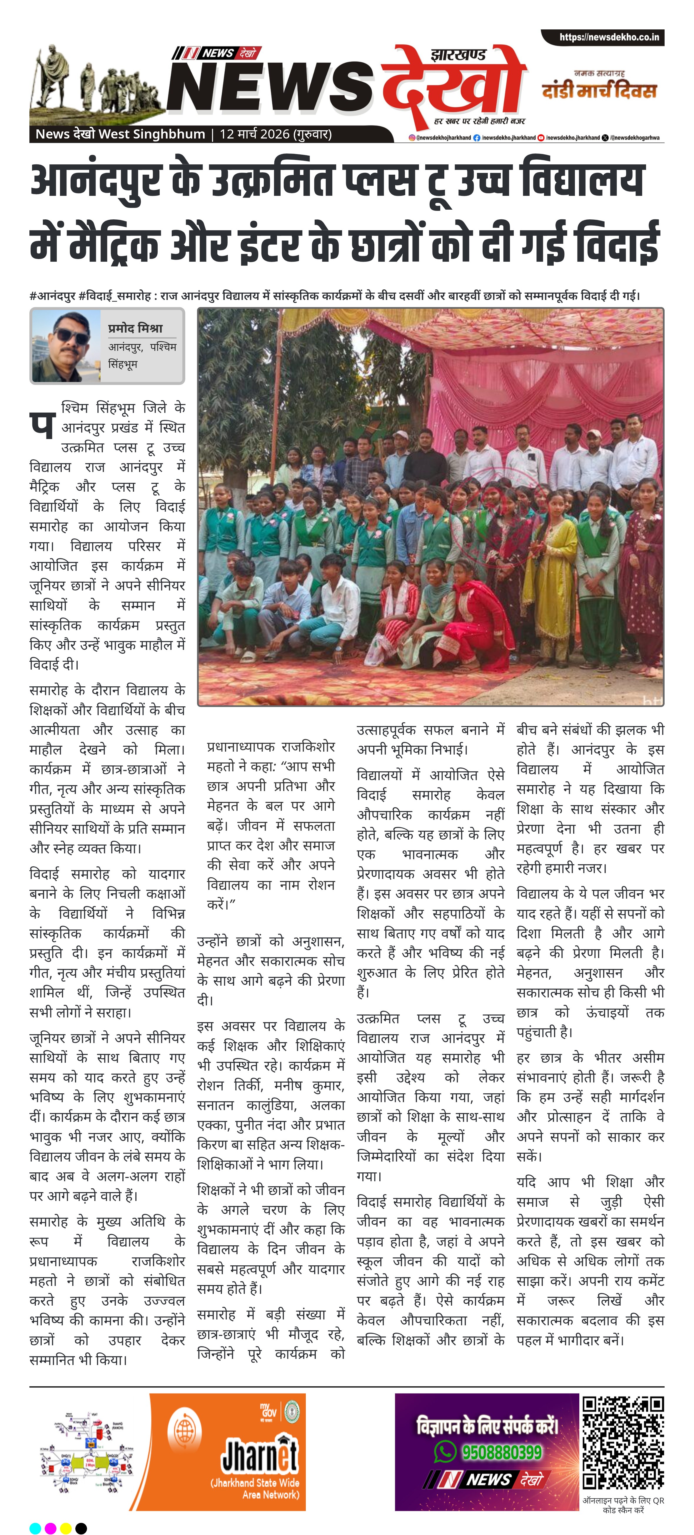 पश्चिम सिंहभूम जिले के आनंदपुर प्रखंड में स्थित उत्क्रमित प्लस टू उच्च विद्यालय राज आनंदपुर में मैट्रिक और प्लस टू के विद्यार्थियों के लिए विदाई समारोह का आयोजन किया गया। विद्यालय परिसर में आयोजित इस कार्यक्रम में जूनियर छात्रों ने अपने सीनियर साथियों के सम्मान में सांस्कृतिक कार्यक्रम प्रस्तुत किए और उन्हें भावुक माहौल में विदाई दी।