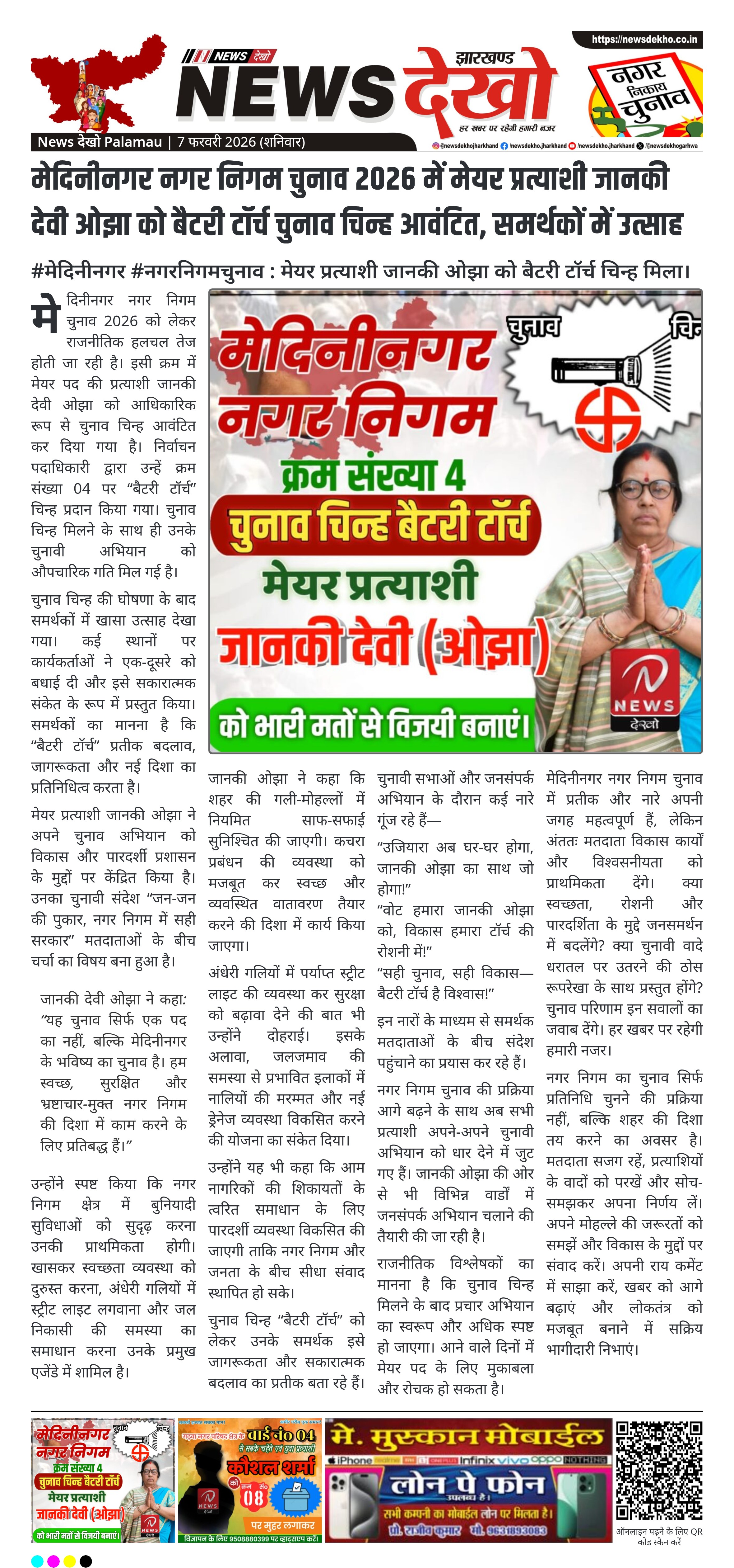जानकी देवी ओझा ने कहा: “यह चुनाव सिर्फ एक पद का नहीं, बल्कि मेदिनीनगर के भविष्य का चुनाव है। हम स्वच्छ, सुरक्षित और भ्रष्टाचार-मुक्त नगर निगम की दिशा में काम करने के लिए प्रतिबद्ध हैं।”