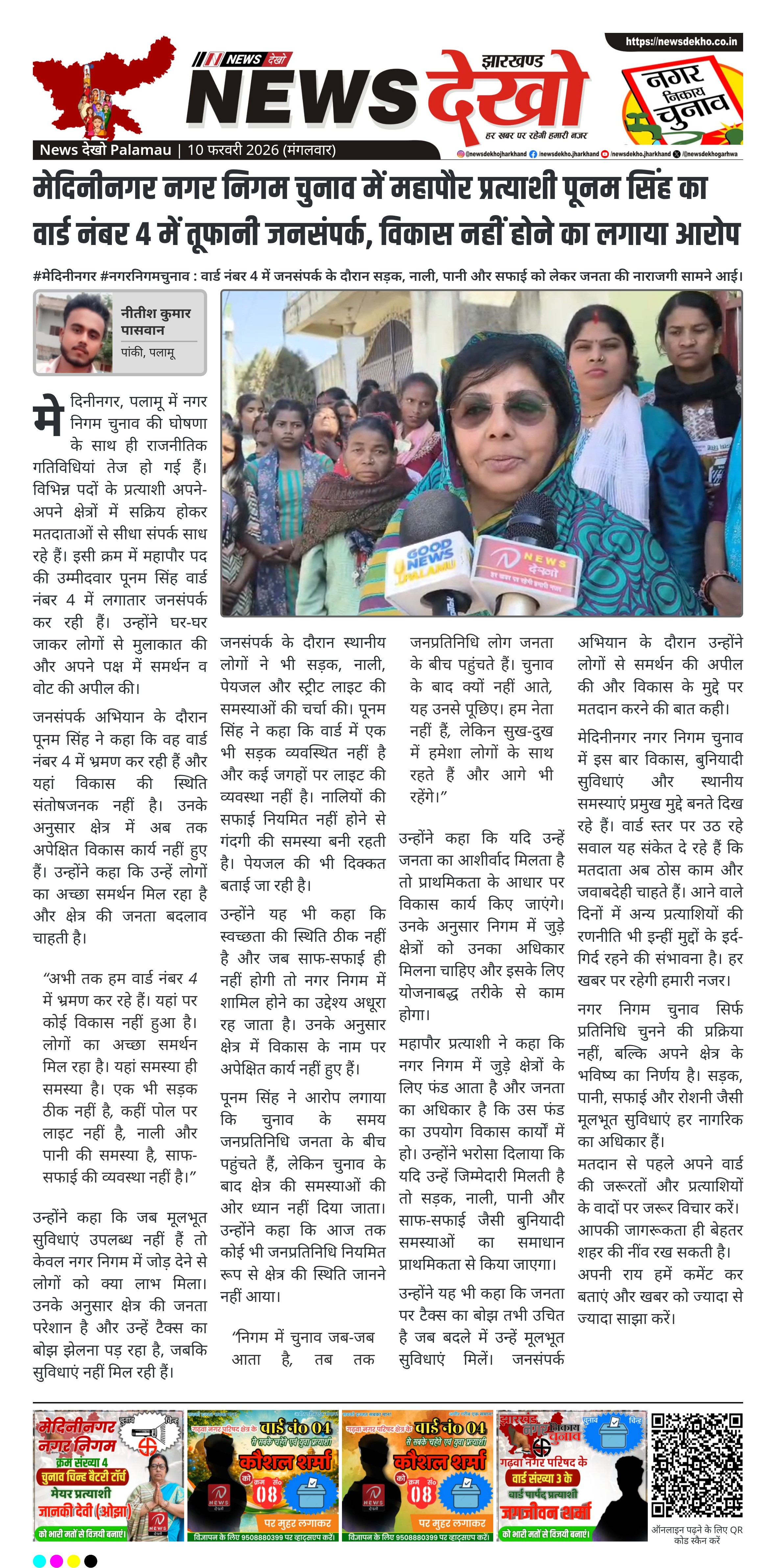 मेदिनीनगर नगर निगम चुनाव की घोषणा के साथ ही सियासी सरगर्मी बढ़ गई है। महापौर पद की उम्मीदवार पूनम सिंह ने वार्ड नंबर 4 में डोर-टू-डोर जनसंपर्क अभियान चलाया। इस दौरान उन्होंने क्षेत्र में विकास नहीं होने का आरोप लगाया। स्थानीय समस्याओं को चुनावी मुद्दा बनाते हुए जनता से समर्थन मांगा।