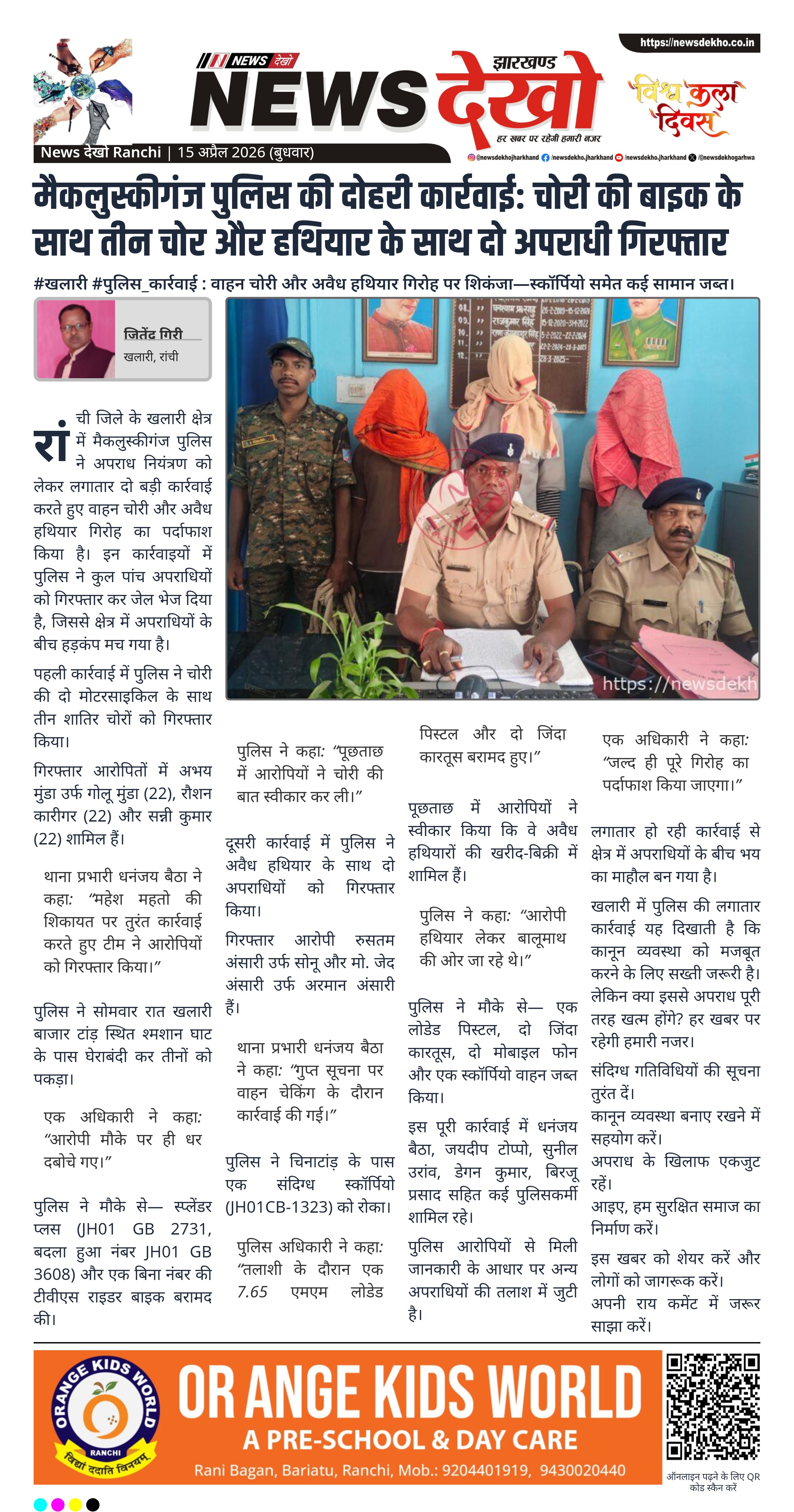 रांची जिले के खलारी क्षेत्र में मैकलुस्कीगंज पुलिस ने अपराध नियंत्रण को लेकर लगातार दो बड़ी कार्रवाई करते हुए वाहन चोरी और अवैध हथियार गिरोह का पर्दाफाश किया है। इन कार्रवाइयों में पुलिस ने कुल पांच अपराधियों को गिरफ्तार कर जेल भेज दिया है, जिससे क्षेत्र में अपराधियों के बीच हड़कंप मच गया है।