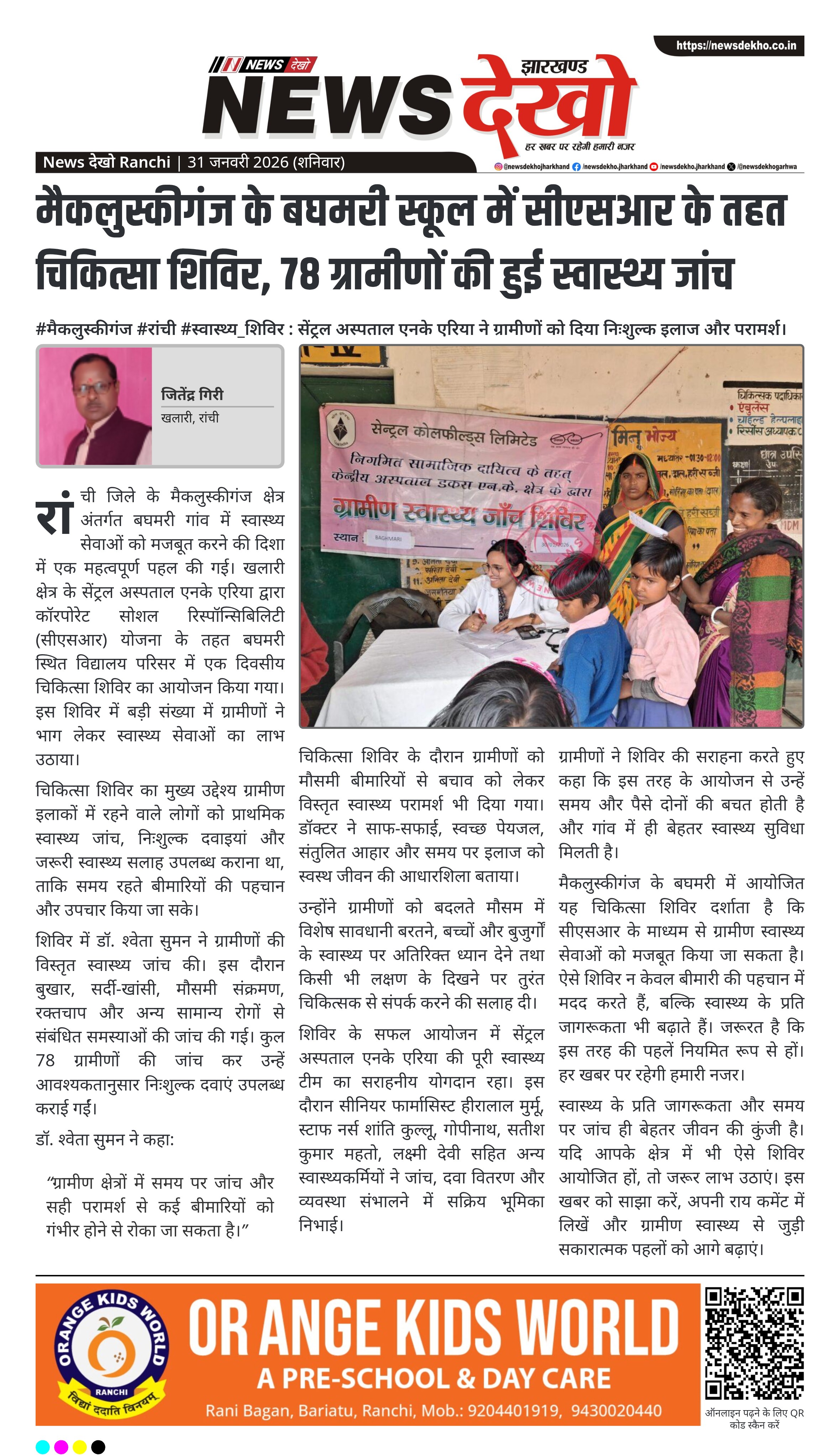 रांची जिले के मैकलुस्कीगंज क्षेत्र में सेंट्रल अस्पताल एनके एरिया द्वारा सीएसआर योजना के तहत एक दिवसीय चिकित्सा शिविर का आयोजन किया गया। बघमरी स्थित विद्यालय परिसर में आयोजित इस शिविर में ग्रामीणों की स्वास्थ्य जांच कर निःशुल्क दवाएं वितरित की गईं। शिविर का उद्देश्य ग्रामीण क्षेत्रों में प्राथमिक स्वास्थ्य सुविधाएं सुलभ कराना और मौसमी बीमारियों के प्रति जागरूकता बढ़ाना रहा। कुल 78 ग्रामीणों ने शिविर का लाभ उठाया।