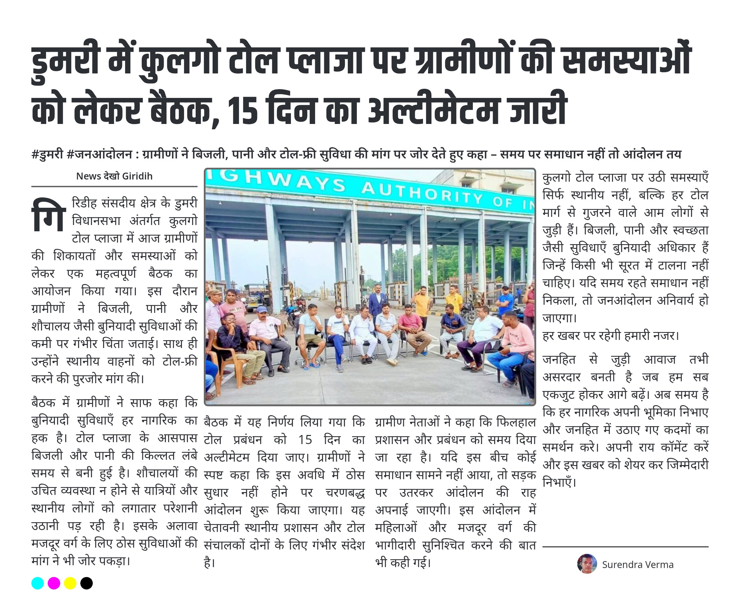 डुमरी में कुलगो टोल प्लाजा पर ग्रामीणों की समस्याओं को लेकर बैठक, 15 दिन का अल्टीमेटम जारी