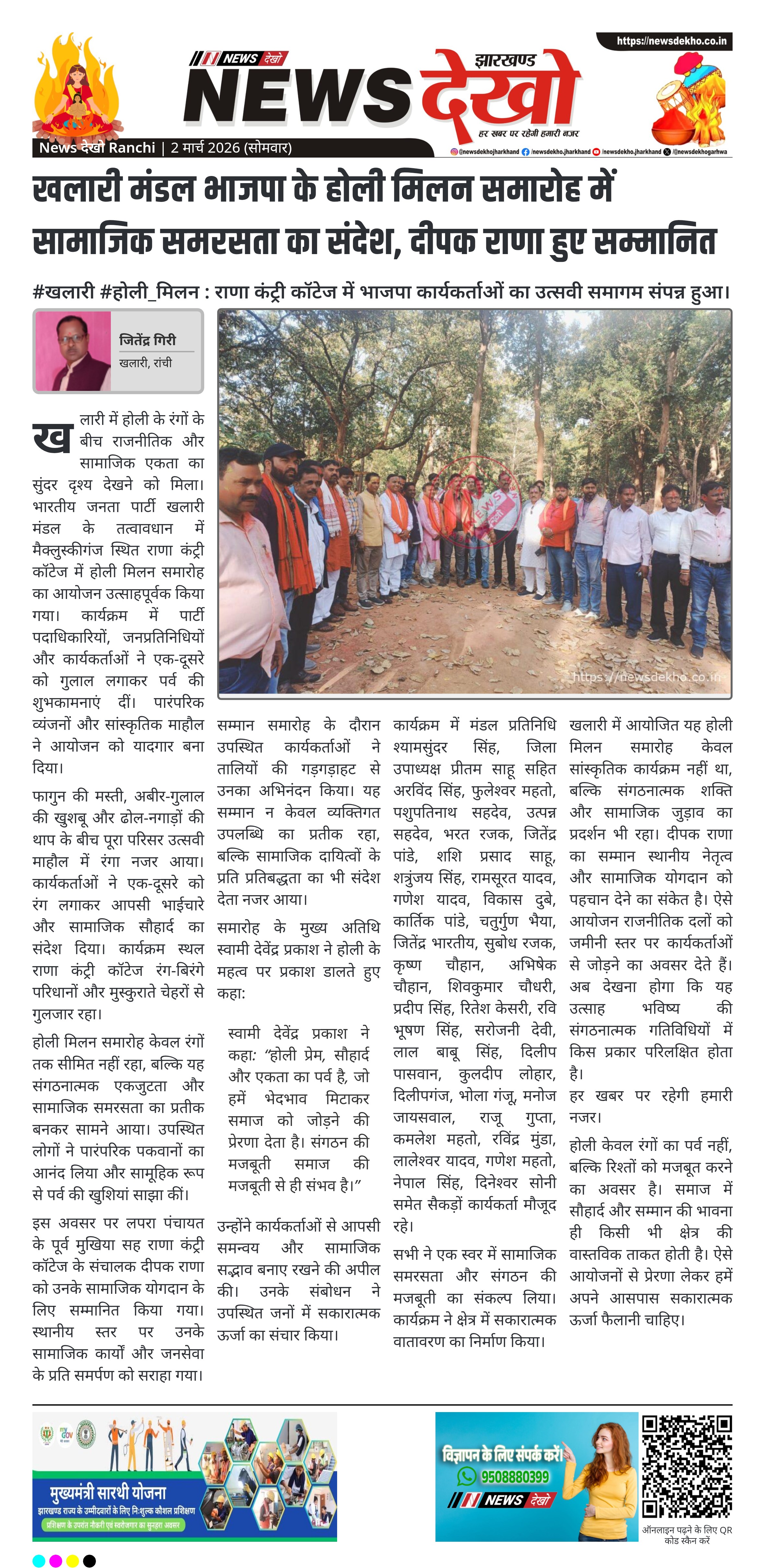 खलारी में आयोजित यह होली मिलन समारोह केवल सांस्कृतिक कार्यक्रम नहीं था, बल्कि संगठनात्मक शक्ति और सामाजिक जुड़ाव का प्रदर्शन भी रहा। दीपक राणा का सम्मान स्थानीय नेतृत्व और सामाजिक योगदान को पहचान देने का संकेत है। ऐसे आयोजन राजनीतिक दलों को जमीनी स्तर पर कार्यकर्ताओं से जोड़ने का अवसर देते हैं। अब देखना होगा कि यह उत्साह भविष्य की संगठनात्मक गतिविधियों में किस प्रकार परिलक्षित होता है।