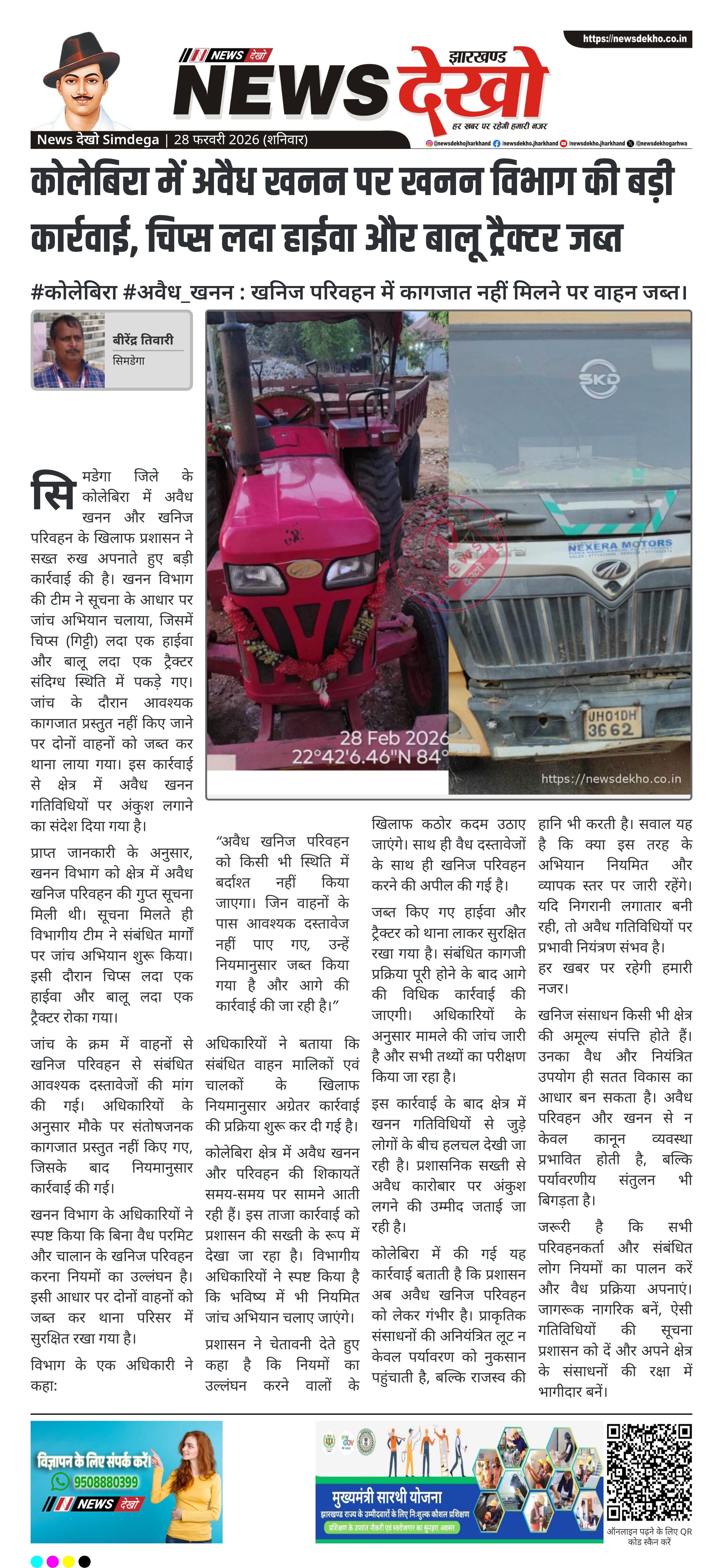 सिमडेगा जिले के कोलेबिरा में अवैध खनन और खनिज परिवहन के खिलाफ प्रशासन ने सख्त रुख अपनाते हुए बड़ी कार्रवाई की है। खनन विभाग की टीम ने सूचना के आधार पर जांच अभियान चलाया, जिसमें चिप्स (गिट्टी) लदा एक हाईवा और बालू लदा एक ट्रैक्टर संदिग्ध स्थिति में पकड़े गए। जांच के दौरान आवश्यक कागजात प्रस्तुत नहीं किए जाने पर दोनों वाहनों को जब्त कर थाना लाया गया। इस कार्रवाई से क्षेत्र में अवैध खनन गतिविधियों पर अंकुश लगाने का संदेश दिया गया है।