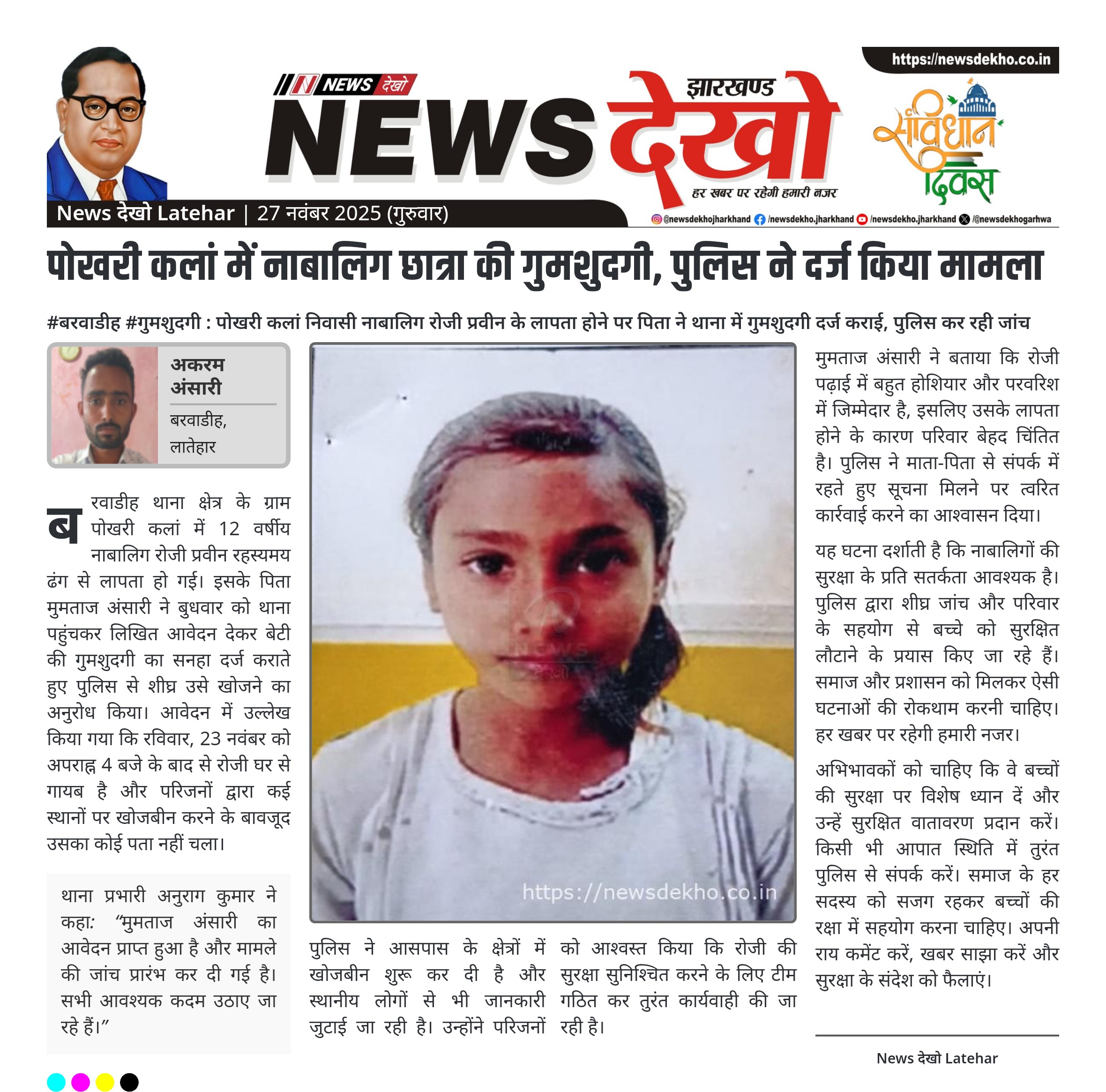 - पोखरी कलां, बरवाडीह थाना क्षेत्र में 12 वर्षीय रोजी प्रवीन लापता।