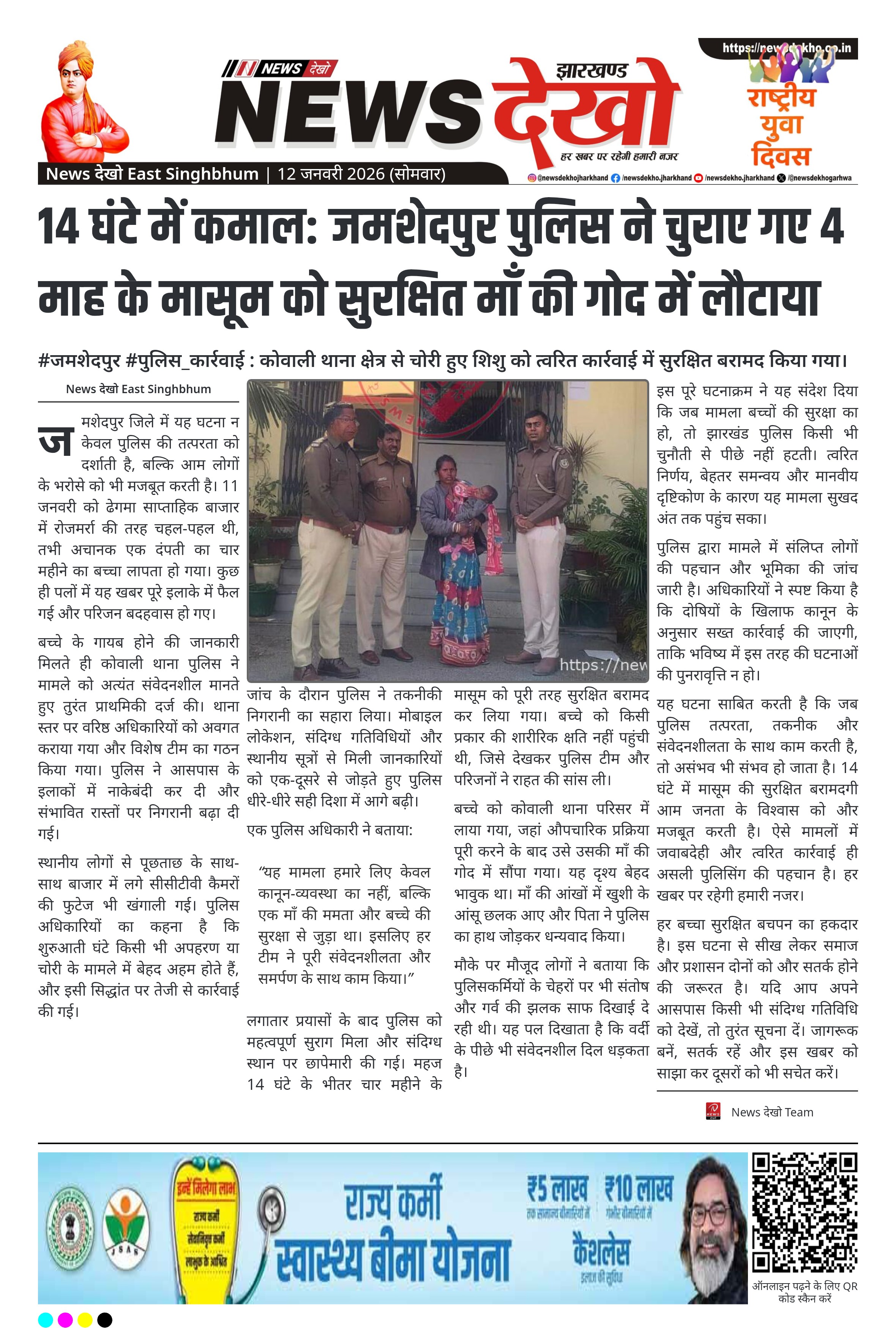 जमशेदपुर के कोवाली थाना क्षेत्र में 4 महीने के एक मासूम के अपहरण की घटना के बाद पुलिस ने महज 14 घंटे के भीतर उसे सकुशल बरामद कर माता-पिता को सौंप दिया। 11 जनवरी 2026 को ढेगमा साप्ताहिक हाट से बच्चा गायब हुआ था, जिससे इलाके में हड़कंप मच गया। सूचना मिलते ही पुलिस ने तकनीकी निगरानी और स्थानीय सूत्रों के सहयोग से व्यापक तलाश अभियान शुरू किया। त्वरित और समन्वित कार्रवाई से यह संवेदनशील मामला सुरक्षित अंत तक पहुंचा।