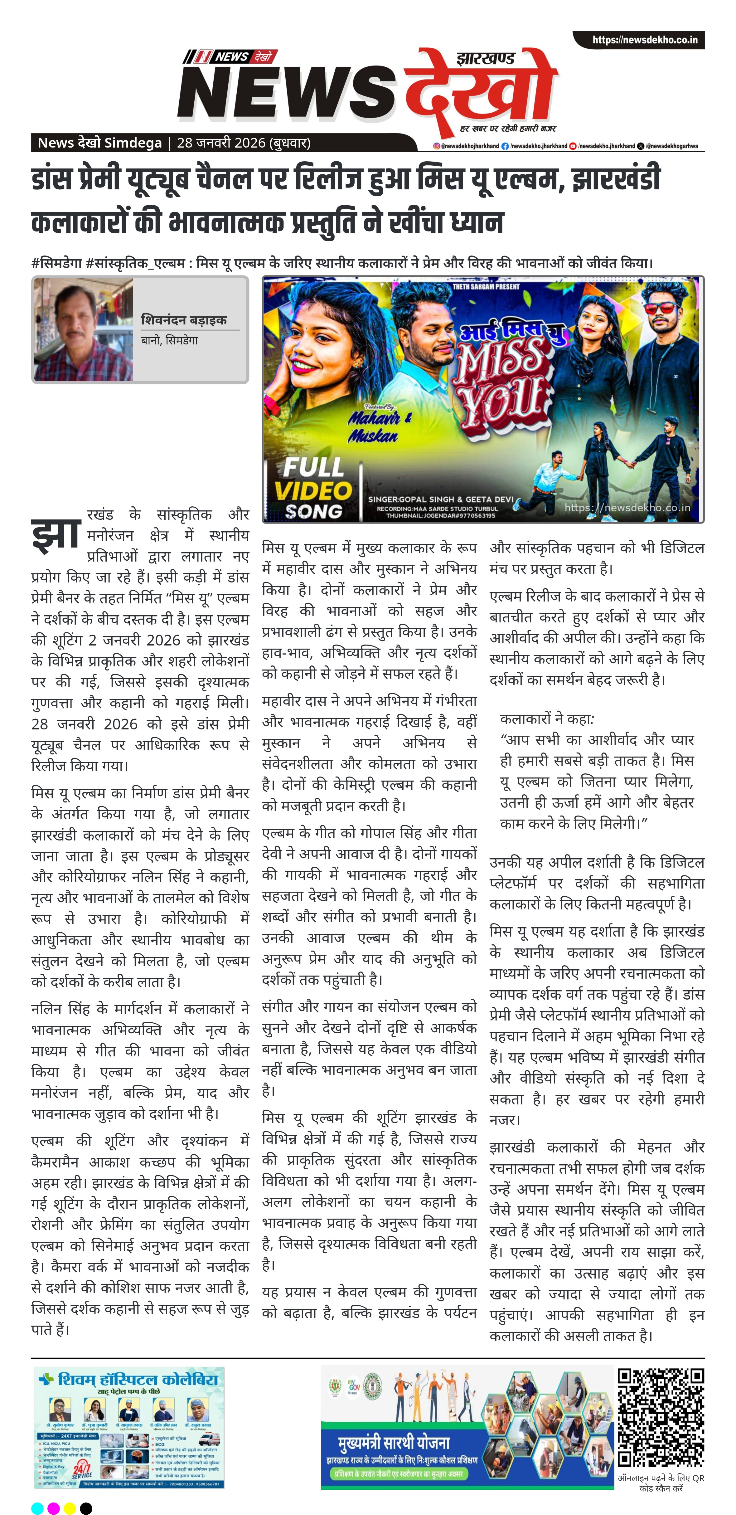 झारखंड के सांस्कृतिक और मनोरंजन क्षेत्र में स्थानीय प्रतिभाओं द्वारा लगातार नए प्रयोग किए जा रहे हैं। इसी कड़ी में डांस प्रेमी बैनर के तहत निर्मित “मिस यू” एल्बम ने दर्शकों के बीच दस्तक दी है। इस एल्बम की शूटिंग 2 जनवरी 2026 को झारखंड के विभिन्न प्राकृतिक और शहरी लोकेशनों पर की गई, जिससे इसकी दृश्यात्मक गुणवत्ता और कहानी को गहराई मिली। 28 जनवरी 2026 को इसे डांस प्रेमी यूट्यूब चैनल पर आधिकारिक रूप से रिलीज किया गया।