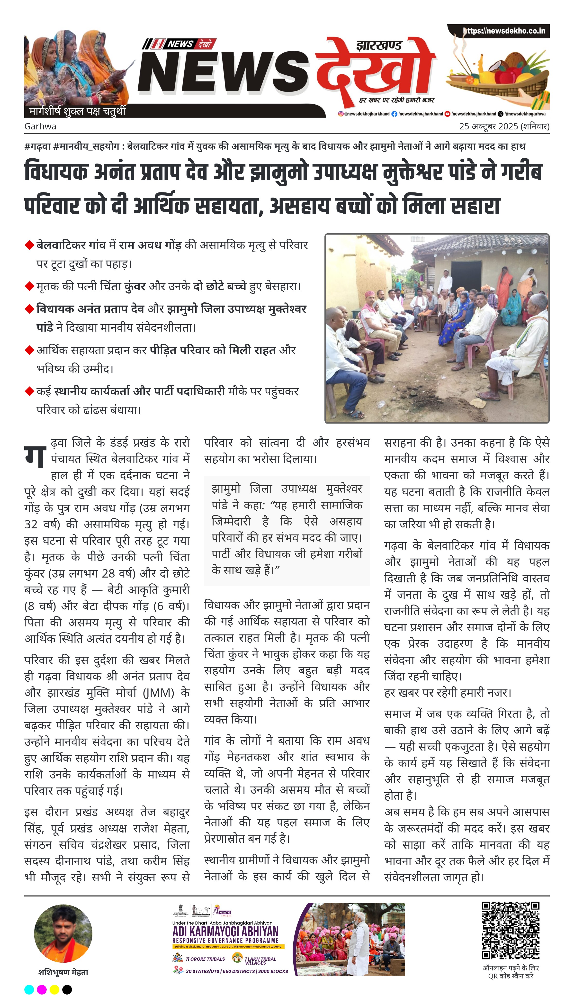 गढ़वा के बेलवाटिकर गांव में विधायक और झामुमो नेताओं की यह पहल दिखाती है कि जब जनप्रतिनिधि वास्तव में जनता के दुख में साथ खड़े हों, तो राजनीति संवेदना का रूप ले लेती है। यह घटना प्रशासन और समाज दोनों के लिए एक प्रेरक उदाहरण है कि मानवीय संवेदना और सहयोग की भावना हमेशा जिंदा रहनी चाहिए।