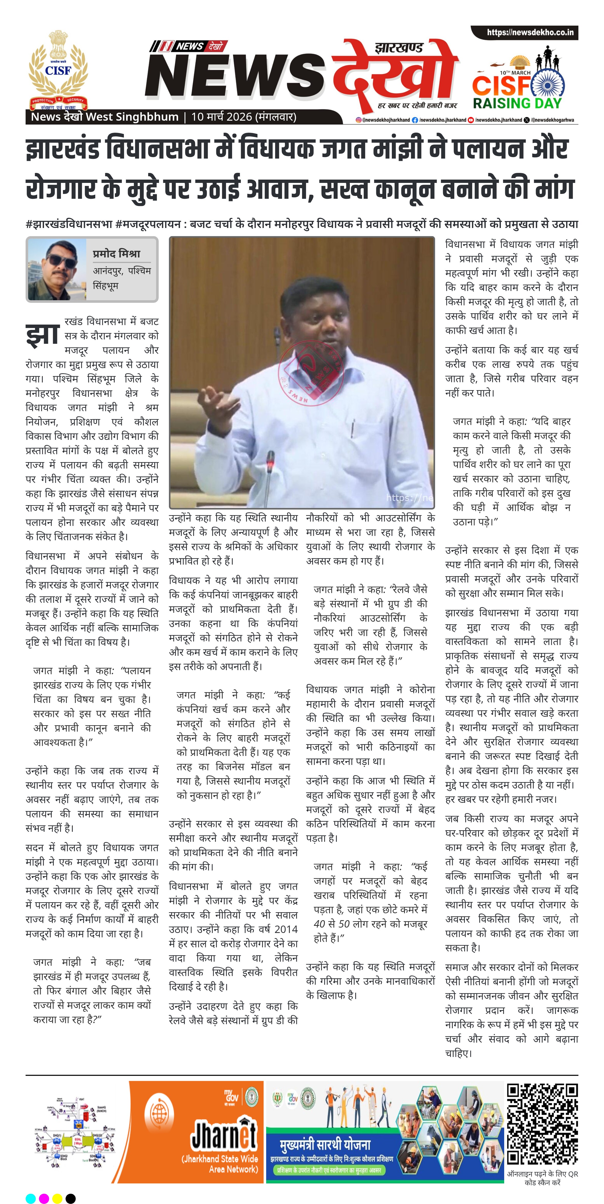 - मनोहरपुर विधायक जगत मांझी ने झारखंड विधानसभा में उठाया मजदूर पलायन का मुद्दा।