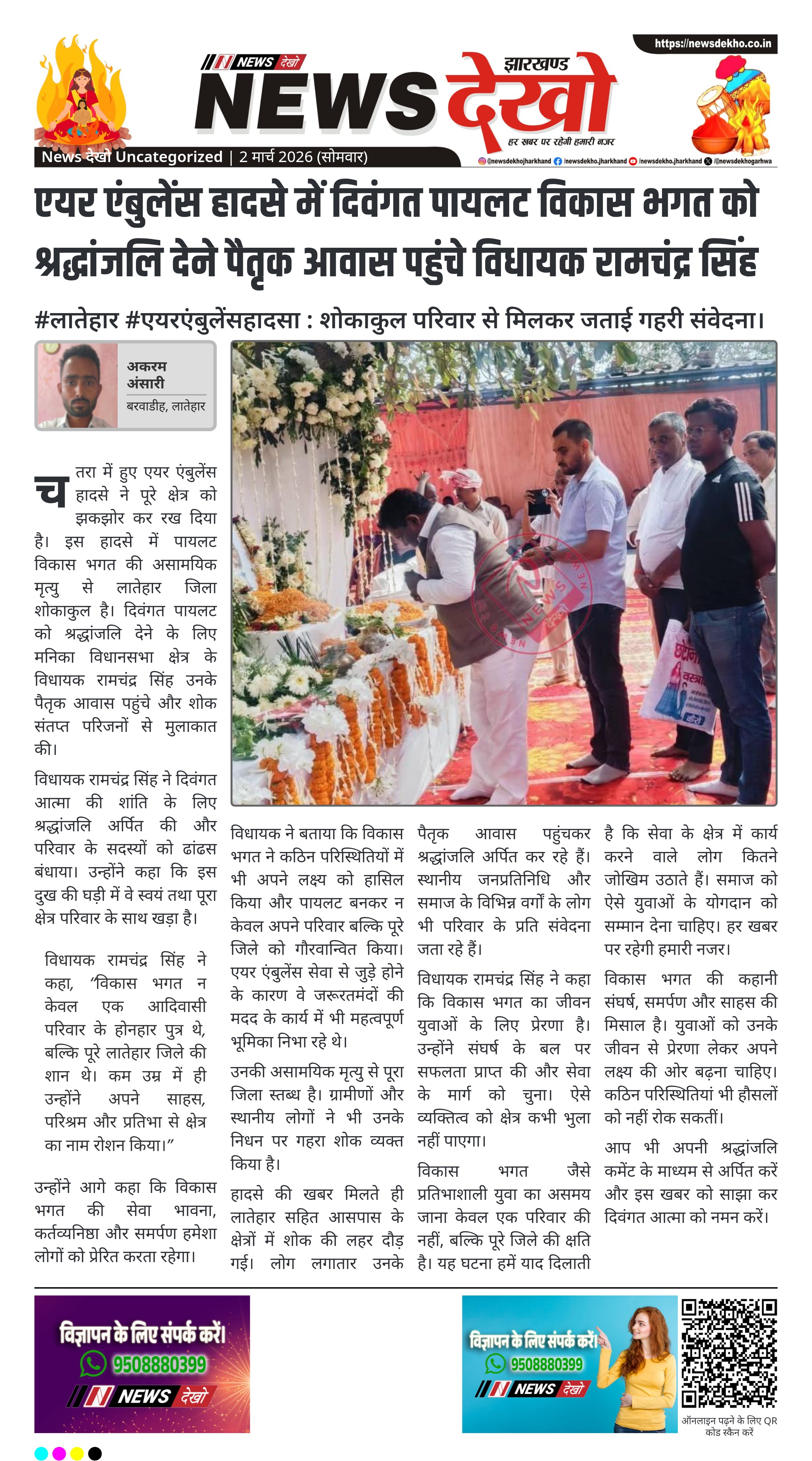 - चतरा एयर एंबुलेंस हादसा में पायलट विकास भगत का निधन।