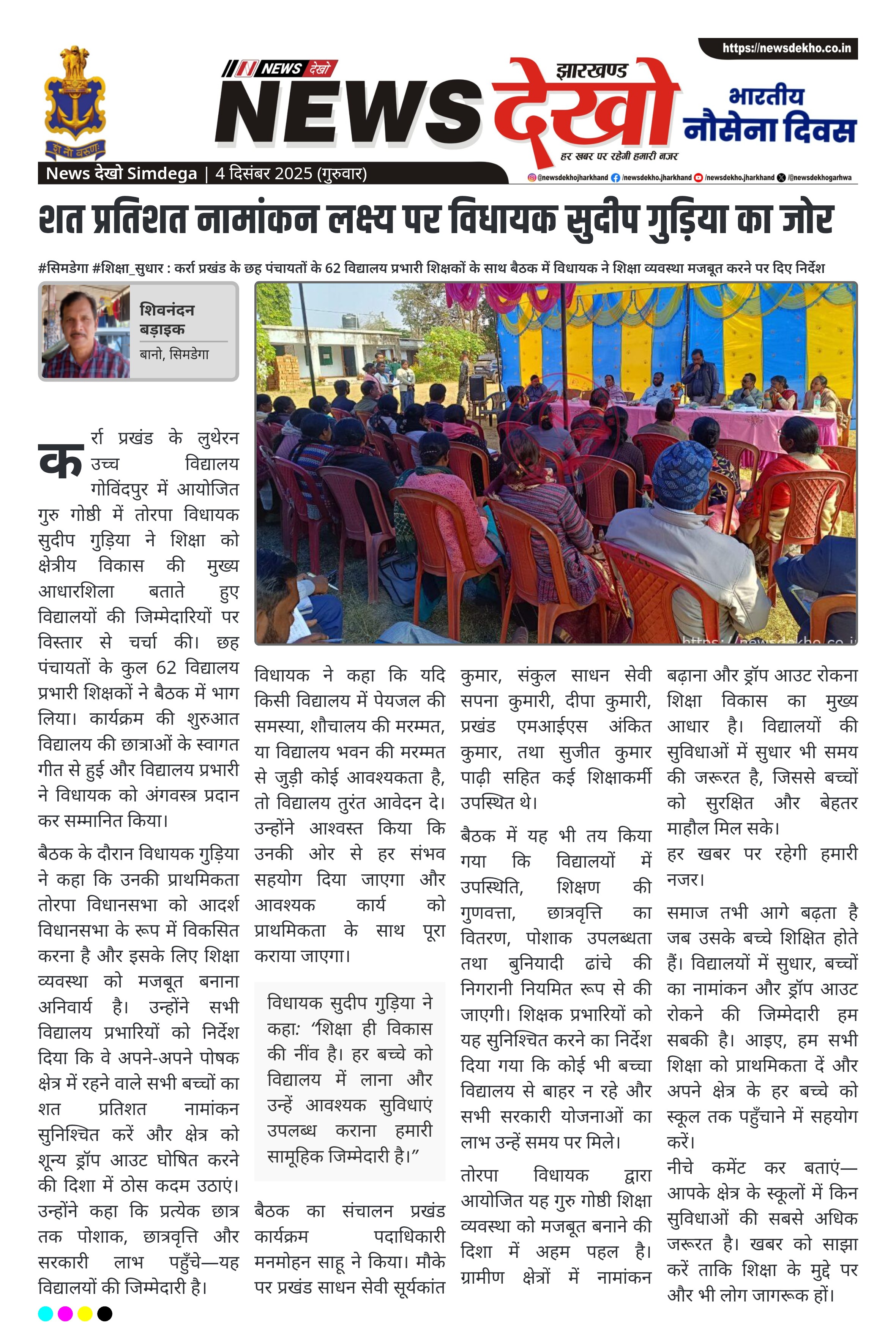 विधायक सुदीप गुड़िया ने कहा: “शिक्षा ही विकास की नींव है। हर बच्चे को विद्यालय में लाना और उन्हें आवश्यक सुविधाएं उपलब्ध कराना हमारी सामूहिक जिम्मेदारी है।”