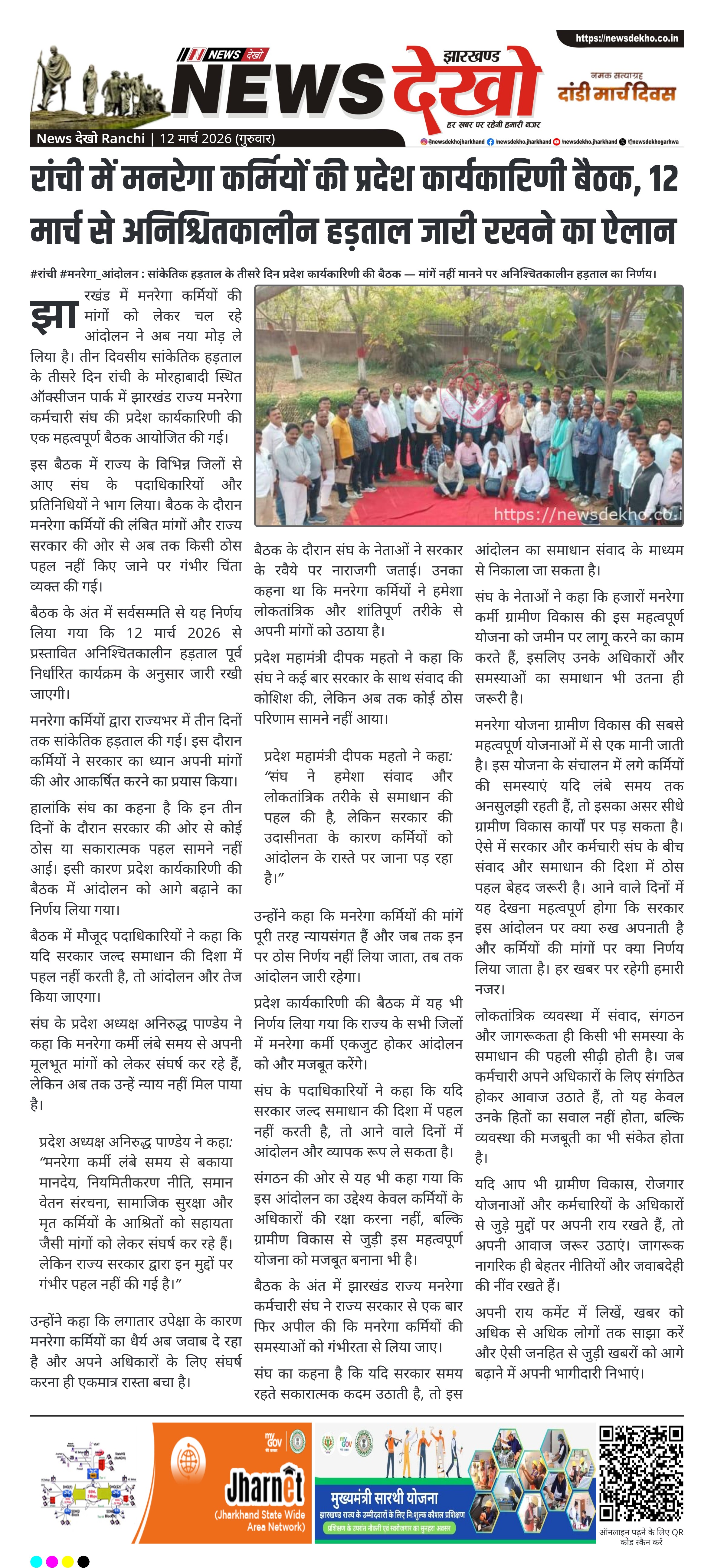 झारखंड में मनरेगा कर्मियों की चल रही तीन दिवसीय सांकेतिक हड़ताल के तीसरे दिन रांची में झारखंड राज्य मनरेगा कर्मचारी संघ की प्रदेश कार्यकारिणी की बैठक आयोजित की गई। बैठक में राज्य सरकार की ओर से मांगों पर ठोस पहल नहीं होने पर चिंता जताई गई। सर्वसम्मति से निर्णय लिया गया कि 12 मार्च 2026 से प्रस्तावित अनिश्चितकालीन हड़ताल पूर्व निर्धारित कार्यक्रम के अनुसार जारी रहेगी। संघ नेताओं ने कहा कि मांगें पूरी होने तक आंदोलन जारी रहेगा।