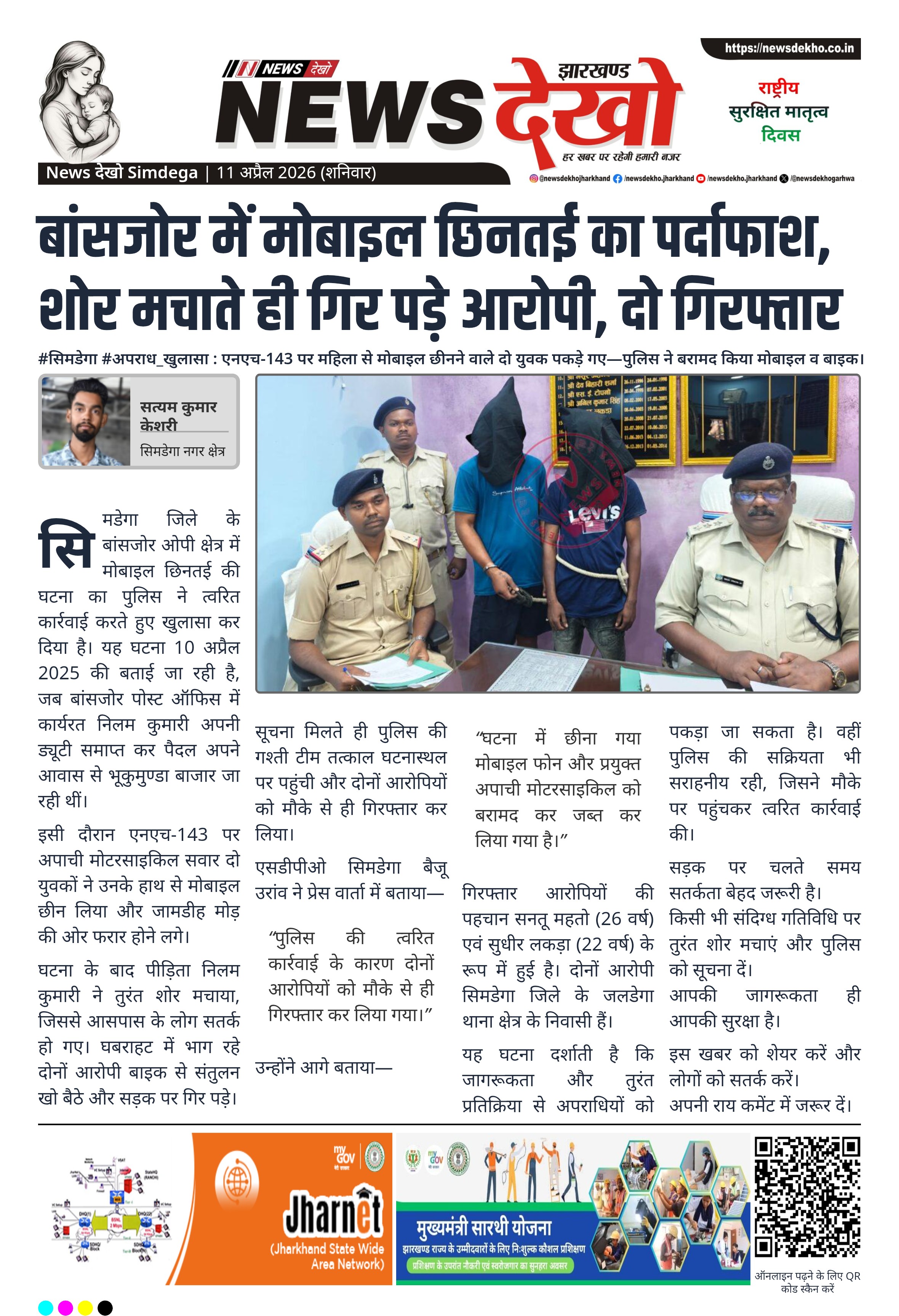 सिमडेगा जिले के बांसजोर ओपी क्षेत्र में मोबाइल छिनतई की घटना का पुलिस ने त्वरित कार्रवाई करते हुए खुलासा कर दिया है। यह घटना 10 अप्रैल 2025 की बताई जा रही है, जब बांसजोर पोस्ट ऑफिस में कार्यरत निलम कुमारी अपनी ड्यूटी समाप्त कर पैदल अपने आवास से भूकुमुण्डा बाजार जा रही थीं।